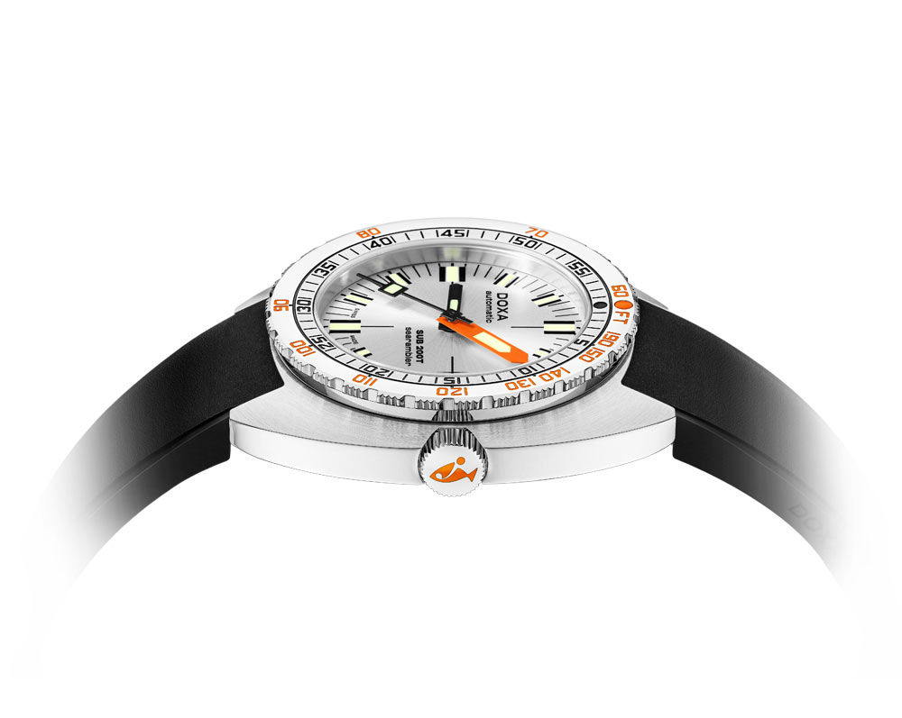 Pánské automatické hodinky Doxa SUB 200T Searambler 8041002120 vynikají neobvyklým tvarem tubusu (tonneau) o průměru 39 mm. Model SUB 200T si zachovává charakteristické rysy původních hodinek SUB, přičemž se přizpůsobuje moderním trendům a dodává eleganci díky menšímu průměru. Na pravé straně je korunka s logem ryby, zajišťující snadné ovládání. Pevně přišroubované víko zajišťuje dokonalou těsnost, chrání hodinky proti vodě a prachu. Vodotěsnost těchto diverských hodinek je hodnocena na 200 metrů (20 ATM), což zaručuje bezpečnost i při hlubokých ponorech. Tento model je vybaven pohodlným a flexibilním černým gumovým páskem, který dodává výraz a styl. Vnitřek hodinek obsahuje přesný automatický mechanismus s rezervou chodu až 38 hodin zajišťující spolehlivost a přesnost chodu.