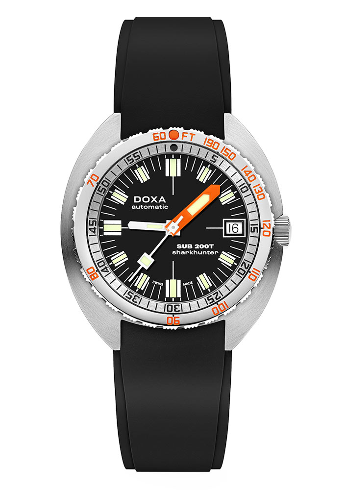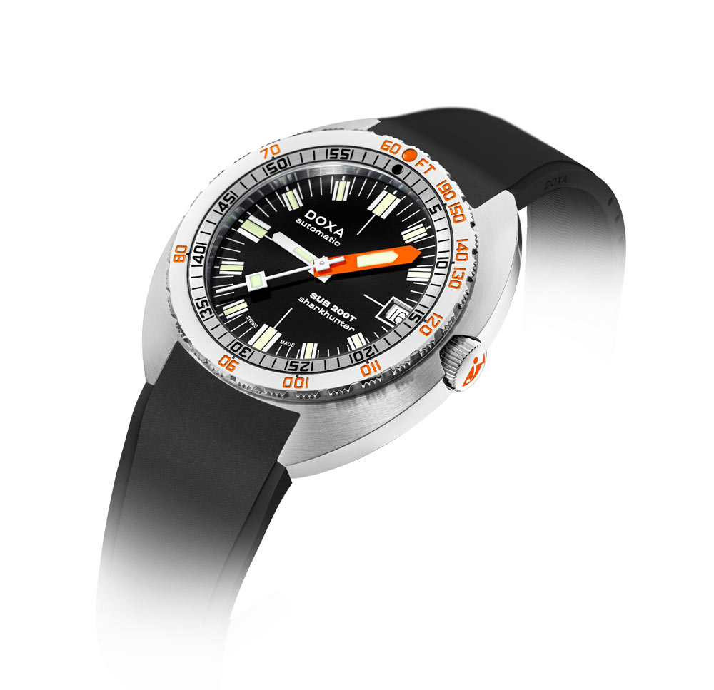 Pánské automatické hodinky Doxa SUB 200T Sharkhunter 8041010120 vynikají neobvyklým tvarem tubusu (tonneau) o průměru 39 mm. Model SUB 200T si zachovává charakteristické rysy původních hodinek SUB, přičemž se přizpůsobuje moderním trendům a dodává eleganci díky menšímu průměru. Na pravé straně je korunka s logem ryby, zajišťující snadné ovládání. Pevně přišroubované víko zajišťuje dokonalou těsnost, chrání hodinky proti vodě a prachu. Vodotěsnost těchto diverských hodinek je hodnocena na 200 metrů (20 ATM), což zaručuje bezpečnost i při hlubokých ponorech. Tento model je vybaven pohodlným a flexibilním černým gumovým páskem, který dodává výraz a styl. Vnitřek hodinek obsahuje přesný automatický mechanismus s rezervou chodu až 38 hodin zajišťující spolehlivost a přesnost chodu.