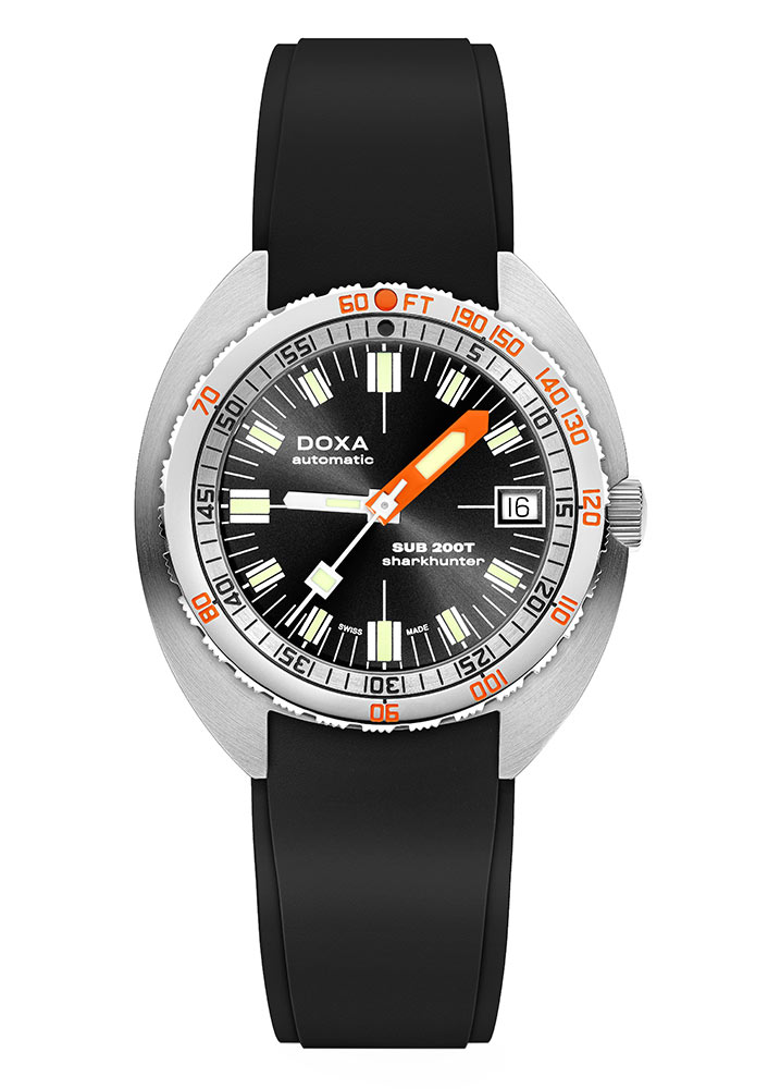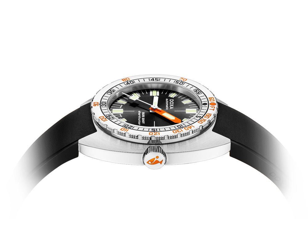 Pánské automatické hodinky Doxa SUB 200T Sharkhunter 80410101S20 vynikají neobvyklým tvarem soudku (tonneau) o průměru 39 mm. Model SUB 200T si zachovává charakteristické rysy původních hodinek SUB, přičemž se přizpůsobuje moderním trendům a dodává eleganci díky menšímu průměru. Na pravé straně je korunka s logem ryby, zajišťující snadné ovládání. Pevně přišroubované víko zajišťuje dokonalou těsnost, chrání hodinky proti vodě a prachu. Vodotěsnost těchto diverských hodinek je hodnocena na 200 metrů (20 ATM), což zaručuje bezpečnost i při hlubokých ponorech. Tento model je vybaven pohodlným a flexibilním černým gumovým páskem, který dodává výraz a styl. Vnitřek hodinek obsahuje přesný automatický mechanismus s rezervou chodu až 38 hodin zajišťující spolehlivost a přesnost chodu.