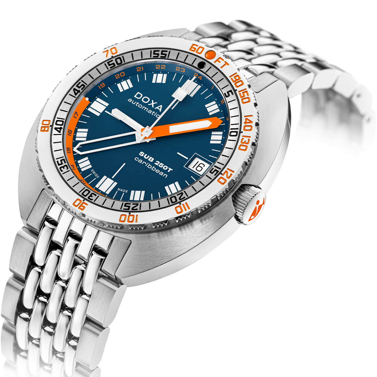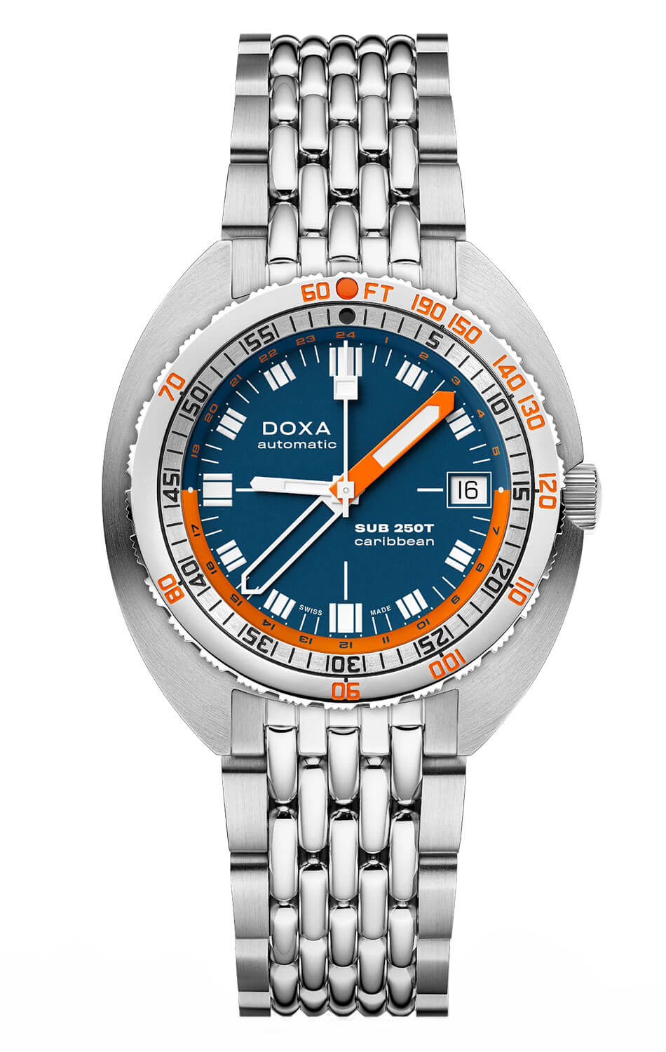 Čitelný modrý číselník, typický pro verzi Caribbean, je poznávacím znakem značky DOXA – navržený s ohledem na maximální kontrast a čitelnost pod vodou. Výrazné indexy a ručky s vrstvou Super-LumiNova® zajišťují výbornou viditelnost i v temných hlubinách. Jemná GMT ručka a okénko s datem na třetí hodině umožňují sledovat čas ve dvou časových pásmech současně – doma i na místě dobrodružství. To vše uzavřeno v designu, který spojuje čistotu funkce s charakterem pravého potápěčského nástroje.