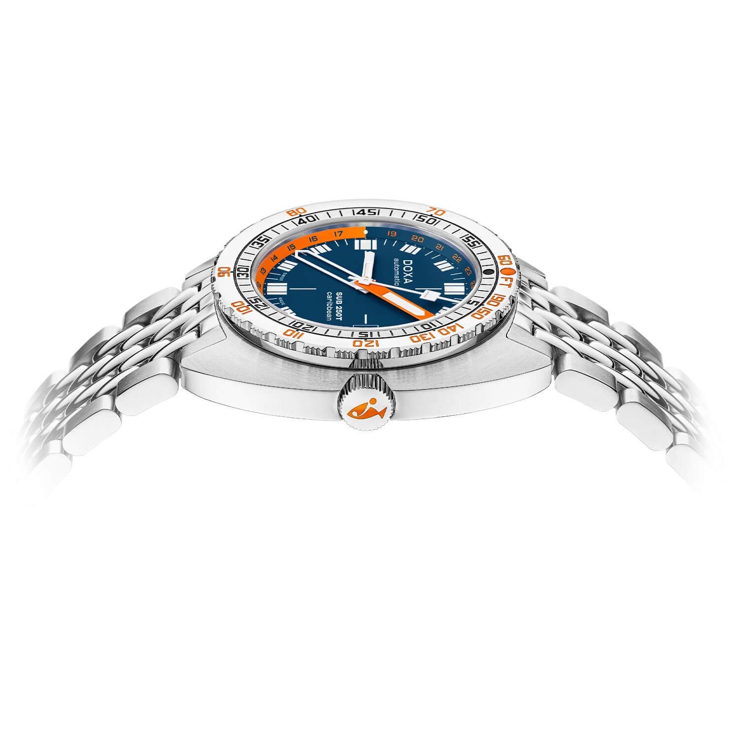 Pouzdro z ušlechtilé oceli o průměru 40 mm si zachovává legendární tvar modelů DOXA SUB a perfektně sedí na zápěstí. Klasické technické prvky jako jednosměrná luneta s potápěčskou stupnicí a šroubovací korunka zajišťují bezpečnost až do hloubky 250 metrů. Safírové sklíčko s antireflexní úpravou chrání ciferník před poškrábáním a zajišťuje čitelnost za všech podmínek, zatímco ocelový náramek typu „beads of rice“ garantuje odolnost a pohodlí – od dekomprese po letištní odbavení.