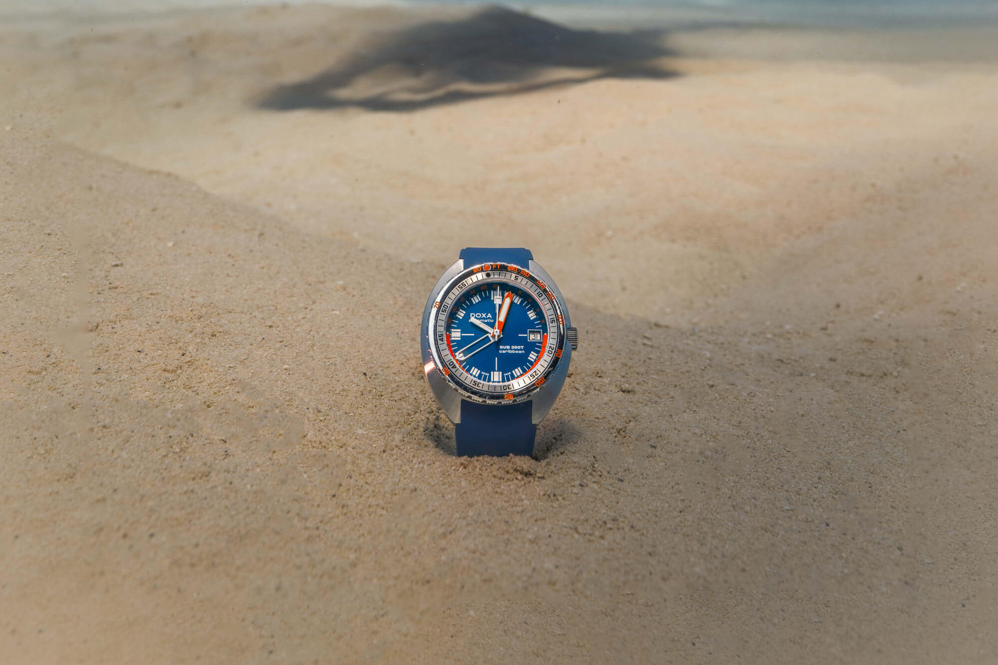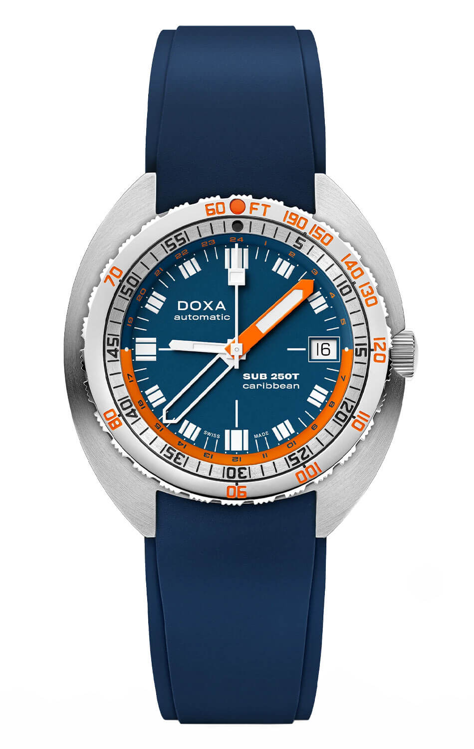 Ocelové pouzdro o kompaktním průměru 40 mm perfektně sedí na zápěstí a zachovává klasický tvar DOXA SUB, který po desetiletí definuje design potápěčských hodinek. Model je vybaven jednosměrnou otočnou lunetou s potápěčskou stupnicí a šroubovací korunkou, které zaručují bezpečné použití pod vodou – až do hloubky 250 metrů. Safírové sklíčko s antireflexní úpravou chrání číselník a poskytuje vynikající čitelnost i na ostrém slunci. Modrý pryžový řemínek FKM ladí s barvami číselníku a zajišťuje komfort i v extrémních podmínkách – jak pod vodou, tak na cestách.