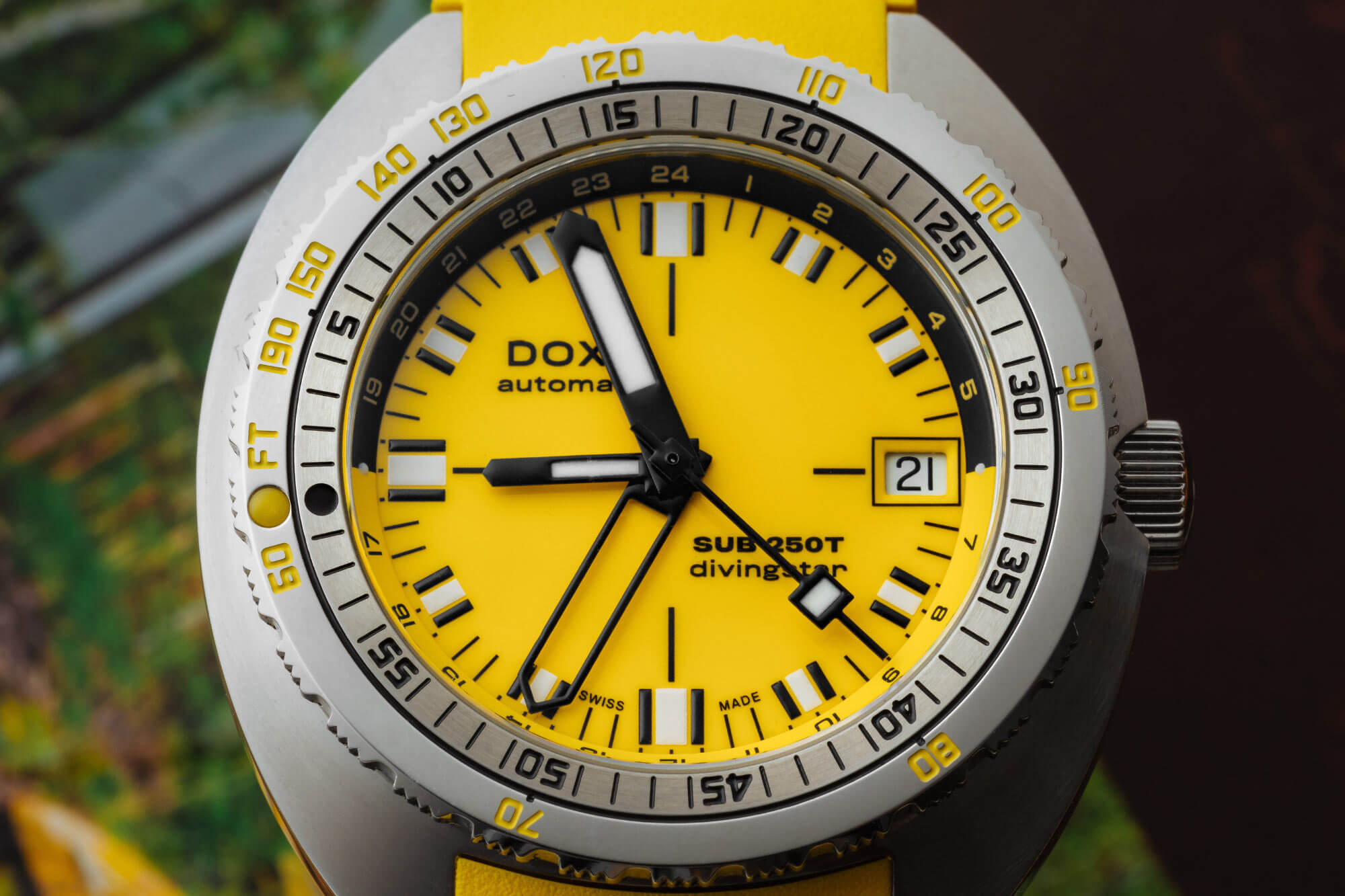 Modrý číselník, typický pro verzi Divingstar, je poznávacím znakem značky DOXA – navržený s ohledem na maximální kontrast a čitelnost pod vodou. Výrazné indexy a ručky s vrstvou Super-LumiNova® zajišťují výbornou viditelnost i v temných hlubinách. Jemná GMT ručka a okénko s datem na třetí hodině umožňují sledovat čas ve dvou časových pásmech současně – doma i na místě dobrodružství. To vše uzavřeno v designu, který spojuje čistotu funkce s charakterem pravého potápěčského nástroje.