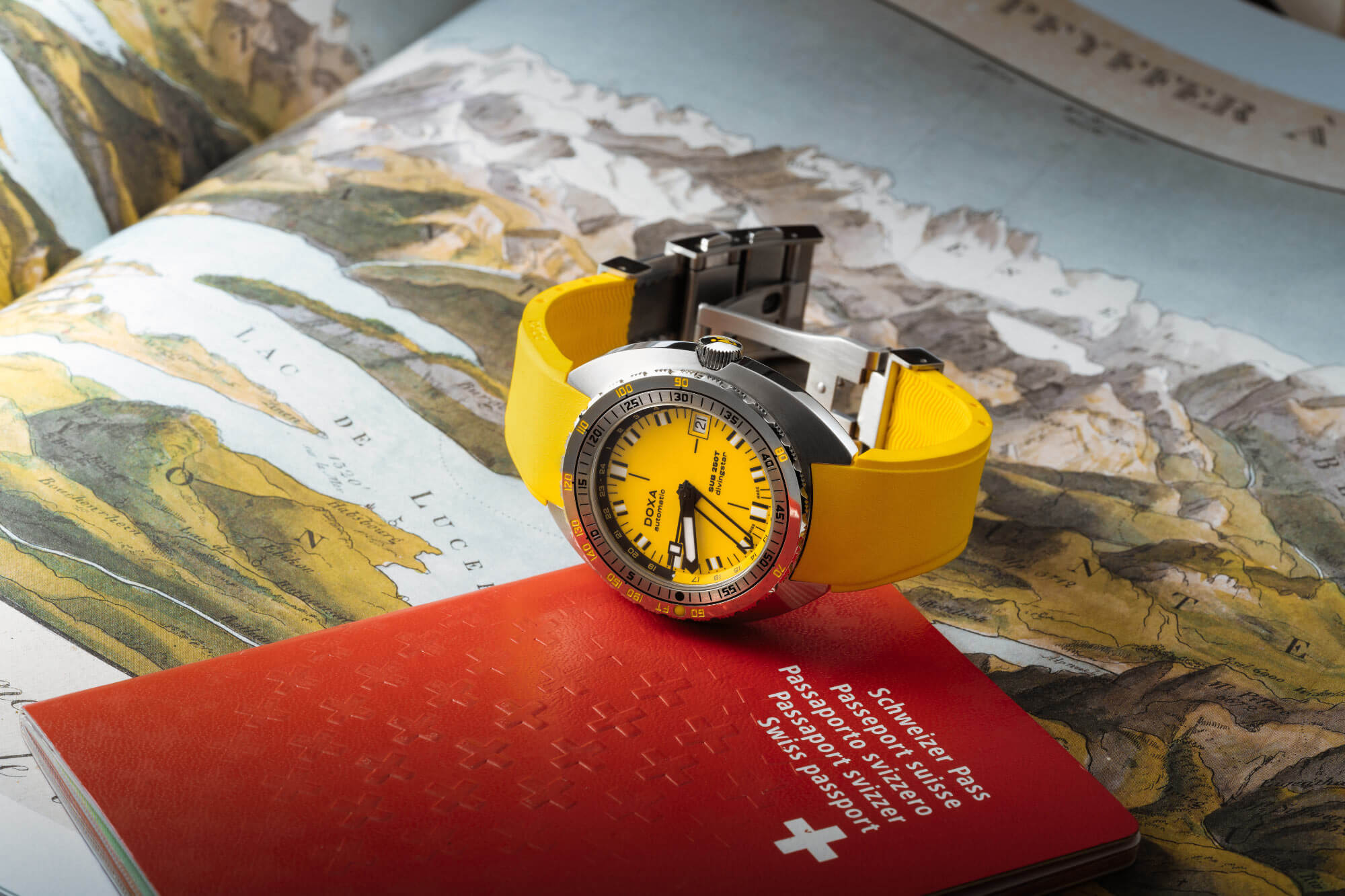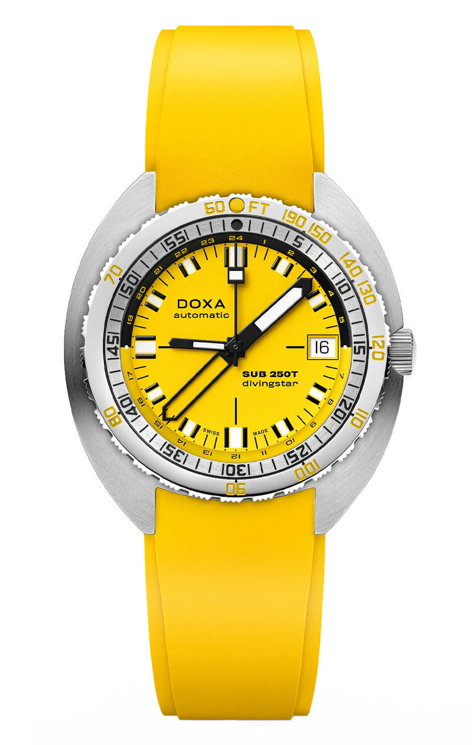 Ocelové pouzdro o kompaktním průměru 40 mm se dokonale usazuje na zápěstí a zachovává klasickou siluetu DOXA SUB, která již desítky let definuje design potápěčských hodinek. Model je vybaven jednosměrnou otočnou lunetou s potápěčskou stupnicí a šroubovací korunkou, které zajišťují bezpečnost pod vodou – až do hloubky 250 metrů. Safírové sklíčko s antireflexní vrstvou chrání číselník a zajišťuje čitelnost i na přímém slunci. Žlutý gumový řemínek FKM ladí s barvami číselníku a zajišťuje pohodlí i v extrémních podmínkách – pod vodou i na cestách.