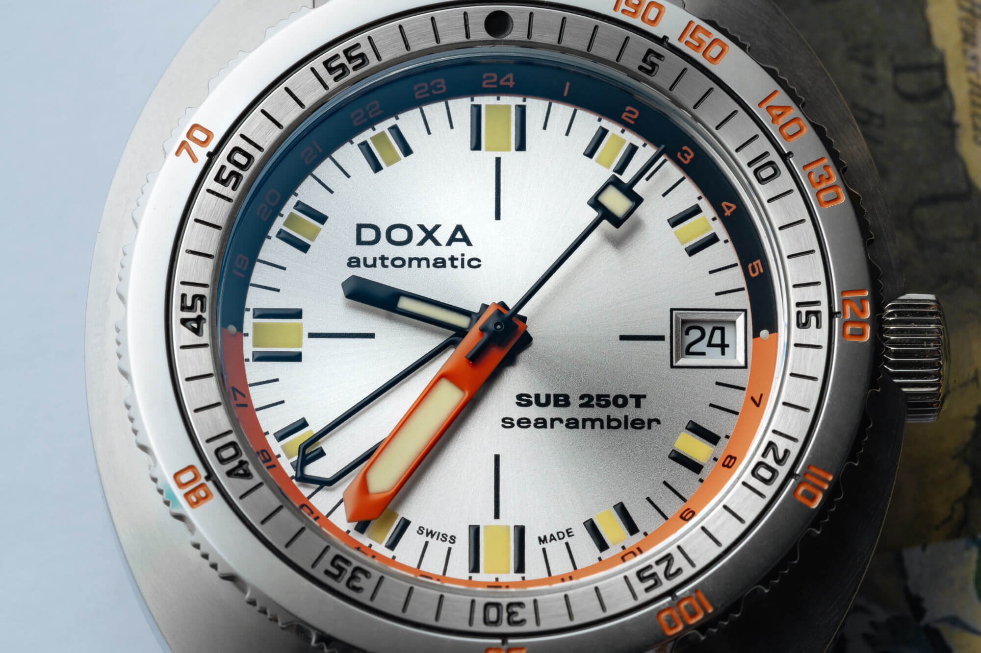 Čitelný stříbrný číselník, typický pro verzi Searambler, je poznávacím znakem značky DOXA – navržený s ohledem na maximální kontrast a čitelnost pod vodou. Výrazné indexy a ručky s vrstvou Super-LumiNova® zajišťují výbornou viditelnost i v temných hlubinách. Jemná GMT ručka a okénko s datem na třetí hodině umožňují sledovat čas ve dvou časových pásmech současně – doma i na místě dobrodružství. To vše uzavřeno v designu, který spojuje čistotu funkce s charakterem pravého potápěčského nástroje.