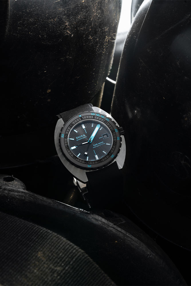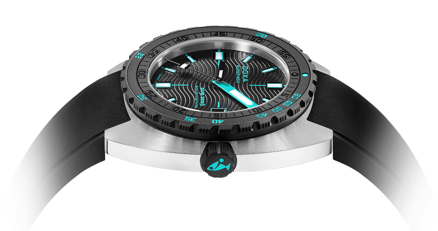 Při zachování průměru 42,5 mm DOXA jemně upravila design pouzdra, aby bylo štíhlejší, pouhých 11,95 mm (ve srovnání s 13,65 mm u SUB 300T), a snížila výšku rámečku o 0,5 mm. Výsledkem je model s lehčími, modernějšími proporcemi. Ocelové pouzdro zachovává funkční integritu hodinek, zatímco černá keramická luneta a šroubovací korunka potvrzují jejich sportovně-elegantní charakter. Diverský časovač Doxa je vybaven černým pryžovým páskem FKM. Popruh má zacvakávací zapínání s prodloužením pro nošení pod oblekem a ikonickým symbolem „DOXA Fish“. S vodotěsností 30 ATM, tedy přibližně 300 metrů, byly hodinky navrženy tak, aby zcela bezpečně prozkoumávaly mořské hlubiny. Důležitým vylepšujícím prvkem těchto pánských diverských hodinek DOXA SUB je automatický heliový ventil.