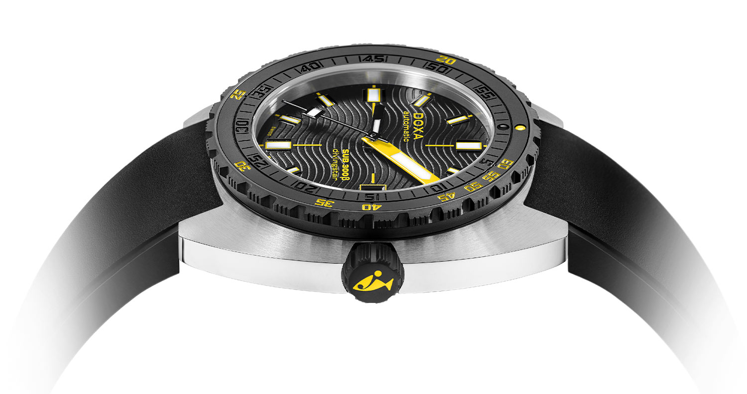 Při zachování průměru 42,5 mm DOXA jemně upravila design pouzdra, aby bylo štíhlejší, pouhých 11,95 mm (ve srovnání s 13,65 mm u SUB 300T), a snížila výšku rámečku o 0,5 mm. Výsledkem je model s lehčími, modernějšími proporcemi. Ocelové pouzdro zachovává funkční integritu hodinek, zatímco černá keramická luneta a šroubovací korunka potvrzují jejich sportovně-elegantní charakter. Diverský časovač Doxa je vybaven černým pryžovým páskem FKM. Popruh má zacvakávací zapínání s prodloužením pro nošení pod oblekem a ikonickým symbolem „DOXA Fish“. S vodotěsností 30 ATM, tedy přibližně 300 metrů, byly hodinky navrženy tak, aby zcela bezpečně prozkoumávaly mořské hlubiny. Důležitým vylepšujícím prvkem těchto pánských diverských hodinek DOXA SUB je automatický heliový ventil.