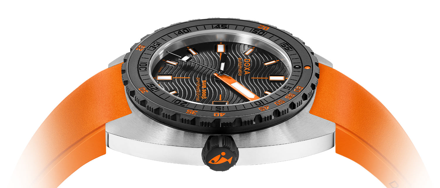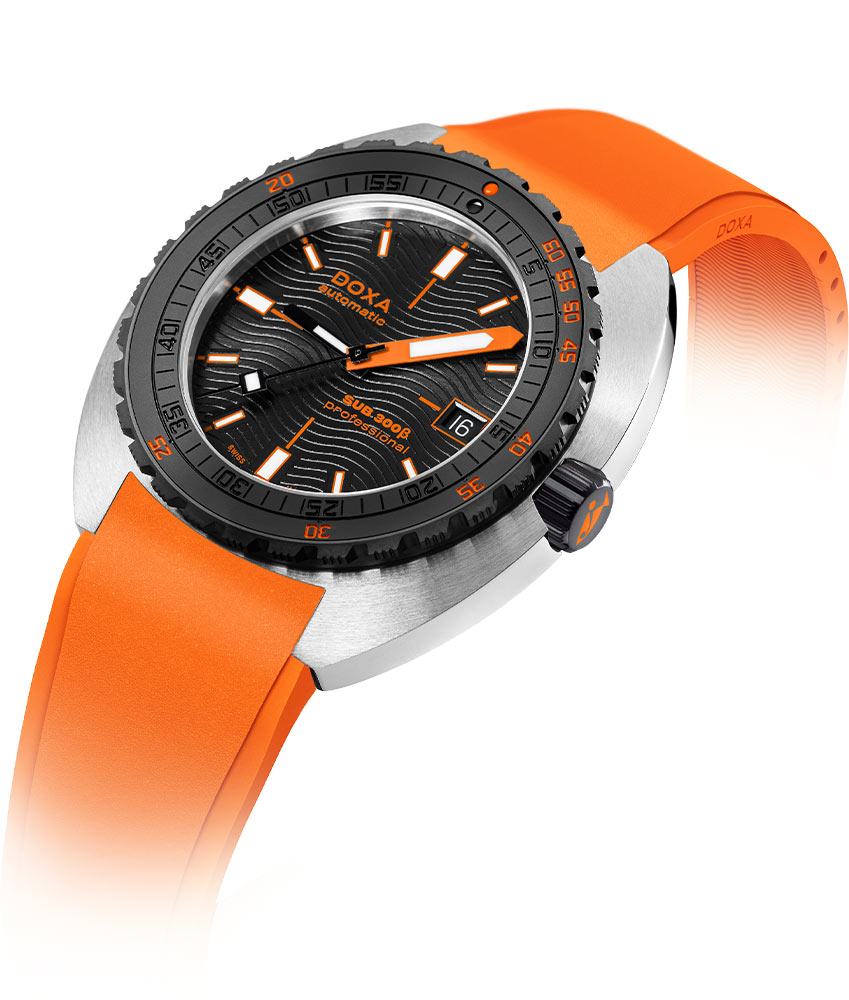 Při zachování průměru 42,5 mm DOXA jemně upravila design pouzdra, aby bylo štíhlejší, pouhých 11,95 mm (ve srovnání s 13,65 mm u SUB 300T), a snížila výšku rámečku o 0,5 mm. Výsledkem je model s lehčími, modernějšími proporcemi. Ocelové pouzdro zachovává funkční integritu hodinek, zatímco černá keramická luneta a šroubovací korunka potvrzují jejich sportovně-elegantní charakter. Diverský časovač Doxa je vybaven oranžovým pryžovým páskem FKM. Popruh má zacvakávací zapínání s prodloužením pro nošení pod oblekem a ikonickým symbolem „DOXA Fish“. S vodotěsností 30 ATM, tedy přibližně 300 metrů, byly hodinky navrženy tak, aby zcela bezpečně prozkoumávaly mořské hlubiny. Důležitým vylepšujícím prvkem těchto pánských diverských hodinek DOXA SUB je automatický heliový ventil.
