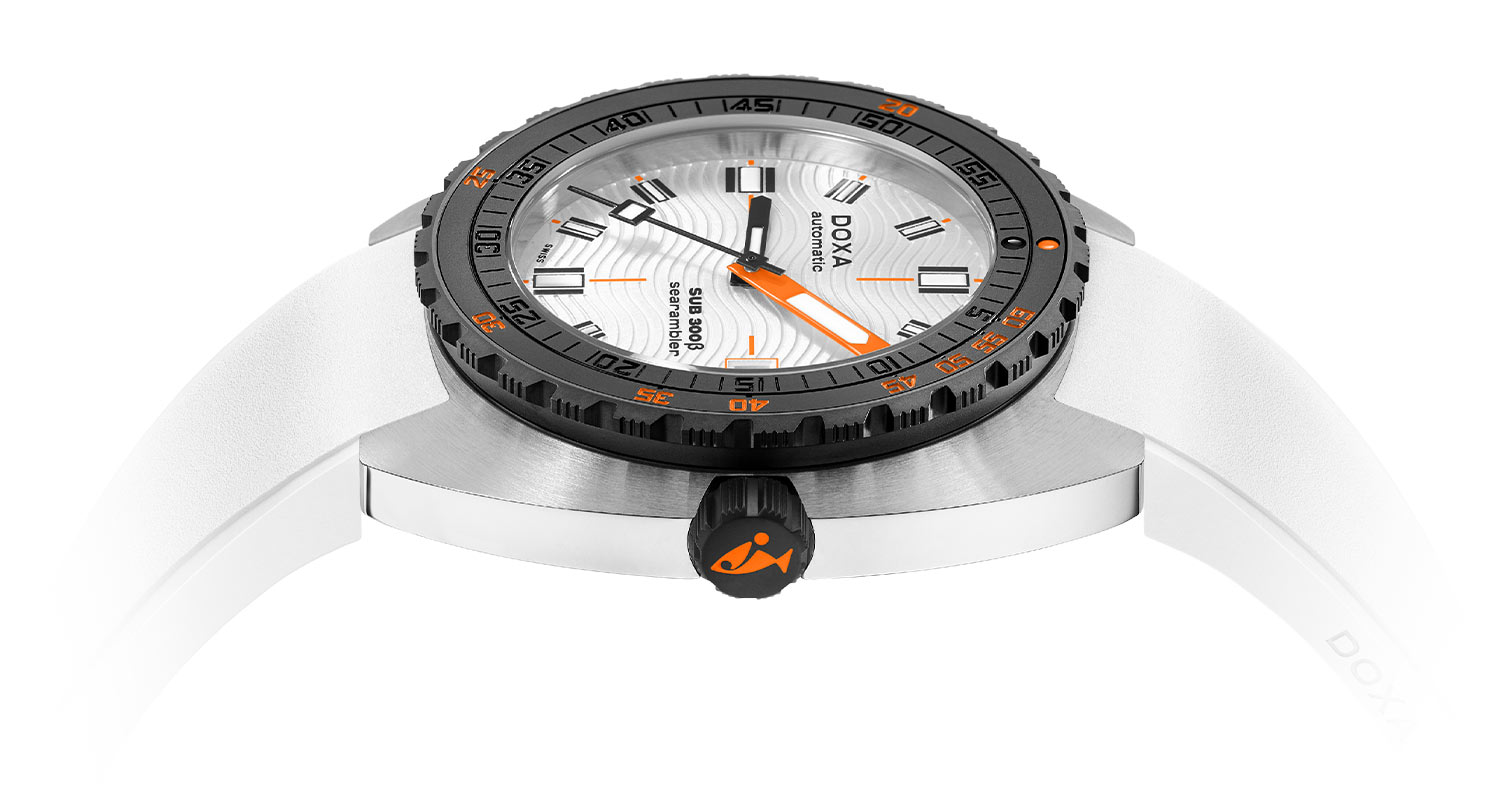 Při zachování průměru 42,5 mm DOXA jemně upravila design pouzdra, aby bylo štíhlejší, pouhých 11,95 mm (ve srovnání s 13,65 mm u SUB 300T), a snížila výšku rámečku o 0,5 mm. Výsledkem je model s lehčími, modernějšími proporcemi. Ocelové pouzdro zachovává funkční integritu hodinek, zatímco černá keramická luneta a šroubovací korunka potvrzují jejich sportovně-elegantní charakter. Diverský časovač Doxa je vybaven bílým pryžovým páskem FKM. Popruh má zacvakávací zapínání s prodloužením pro nošení pod oblekem a ikonickým symbolem „DOXA Fish“. S vodotěsností 30 ATM, tedy přibližně 300 metrů, byly hodinky navrženy tak, aby zcela bezpečně prozkoumávaly mořské hlubiny. Důležitým vylepšujícím prvkem těchto pánských diverských hodinek DOXA SUB je automatický heliový ventil.