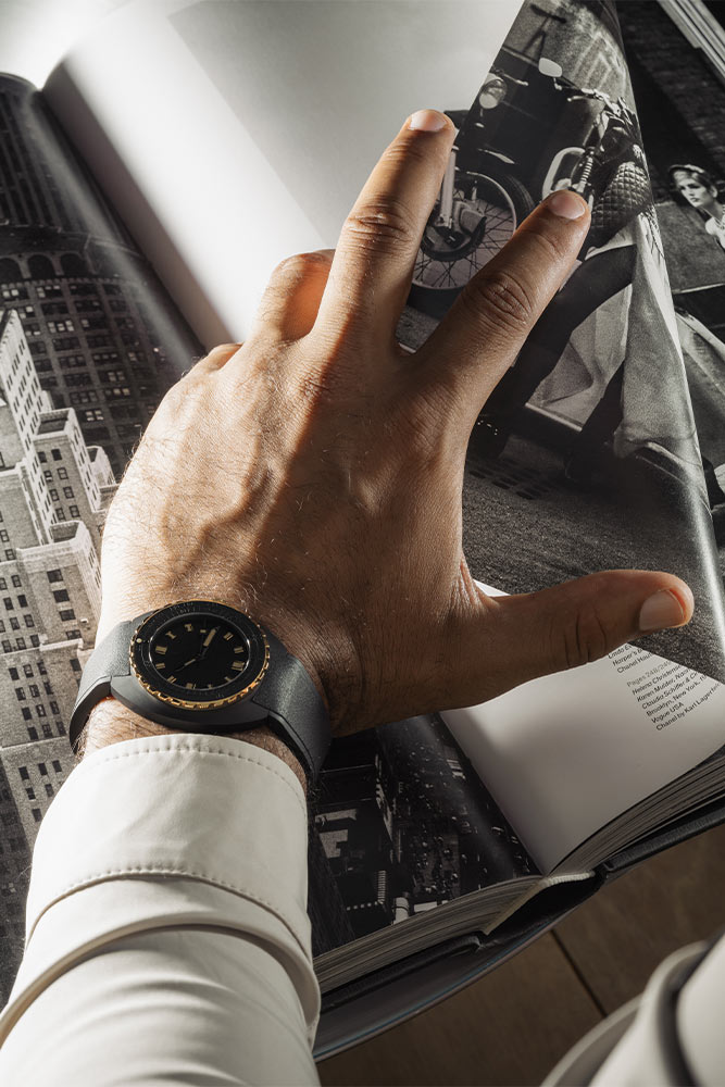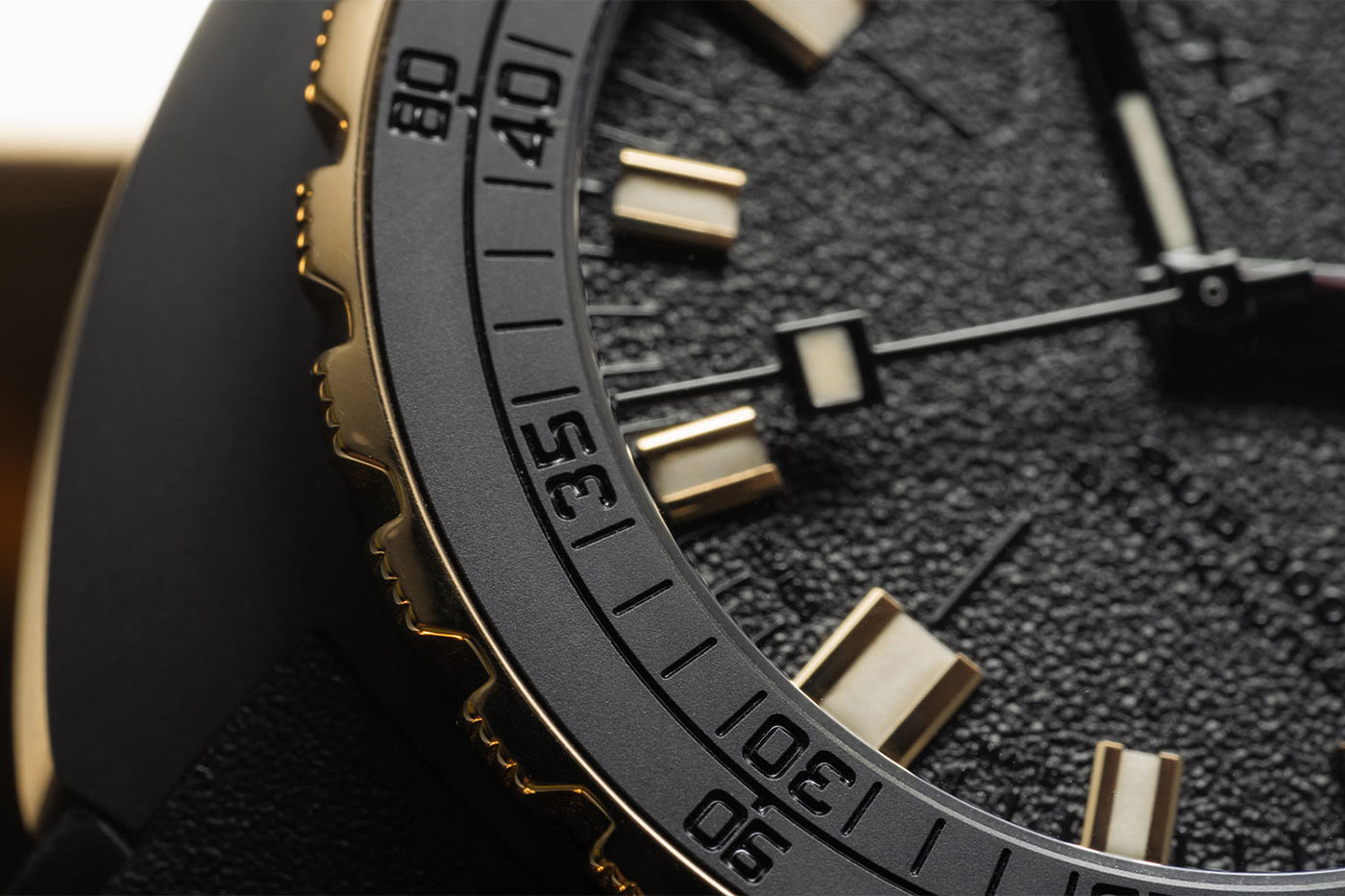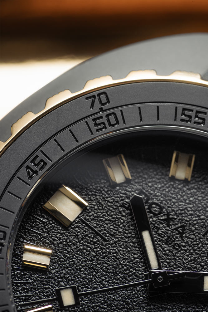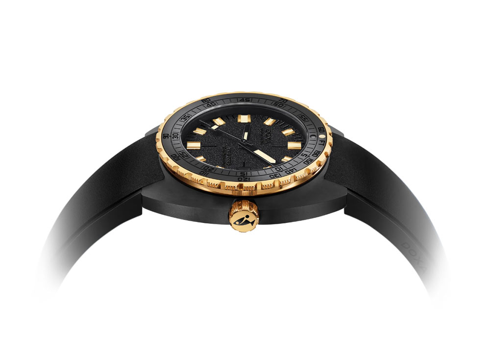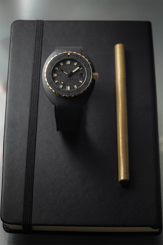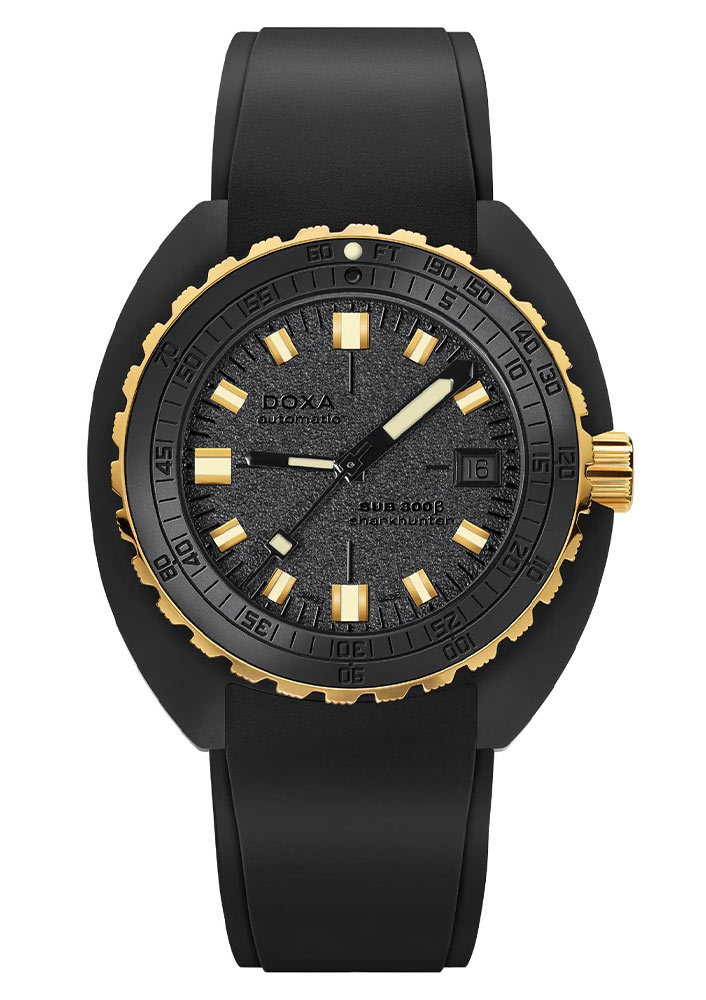 Výsledkem je extravagance se smyslem pro proporce a výběr materiálů, které hodinky spojují se současností. Černé pouzdro ve tvaru sudu je vyrobeno z lehkého a odolného titanu. Matná luneta se stupnicí měřenou ve stopách je vyrobena z keramiky. Matný ciferník se vyznačuje zrnitou texturou s černými značkami a oslnivým kontrastem s klíčovými informacemi, které poskytují ručičky a indexy, a funkční prvky lunety a korunky vyrobené z 18K 3N zlata. Celý je pod ochranou safírového skla odolného proti poškrábání. Spolehlivost měření času je zaručena švýcarským mechanickým mechanismem s automatickým natahovacím systémem certifikovaným jako COSC chronometr. Za svou jedinečnou výzdobu je zodpovědná DOXA. Automatické hodinky COSC DOXA SUB 300β Sharkhunter mají černý pryžový řemínek vyrobený z vysoce kvalitní pryže FKM pro ultra pohodlné nošení.