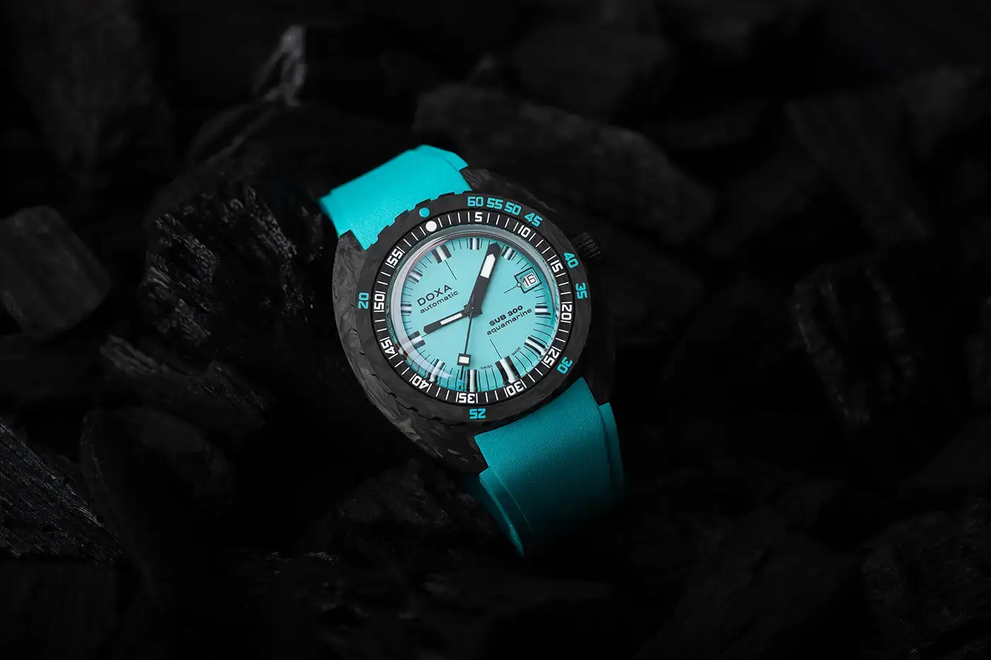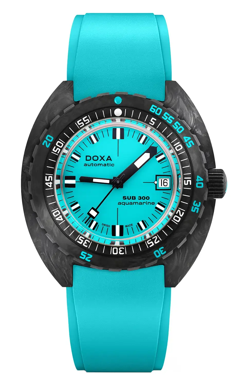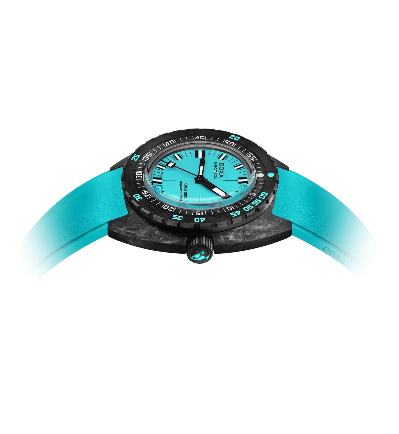 Výše uvedené diverské hodinky řady SUB 300 se vyznačují tlakově odolným karbonovým pouzdrem o rozměrech 42,5 mm x 45 mm , které kromě toho, že je lehké, a proto praktické, chrání Machineek a šroubovací korunku s exkluzivním symbolem ryby Doxy. Jeho třída vodotěsnosti je 300 metrů , což odpovídá asi 980 stopám. Ouška pouzdra jsou připevněna na tyrkysovém pásku s názvem DOXA na obou stranách, nastavitelným prodloužením a černou skládací sponou potaženou PVD zdobenou luxusním symbolem DOXA Fish. Díky jedinečnému ráčnovému mechanismu zabudovanému do inovativní, flexibilní spony jsou hodinky snadno nastavitelné na zápěstí v neoprenu.