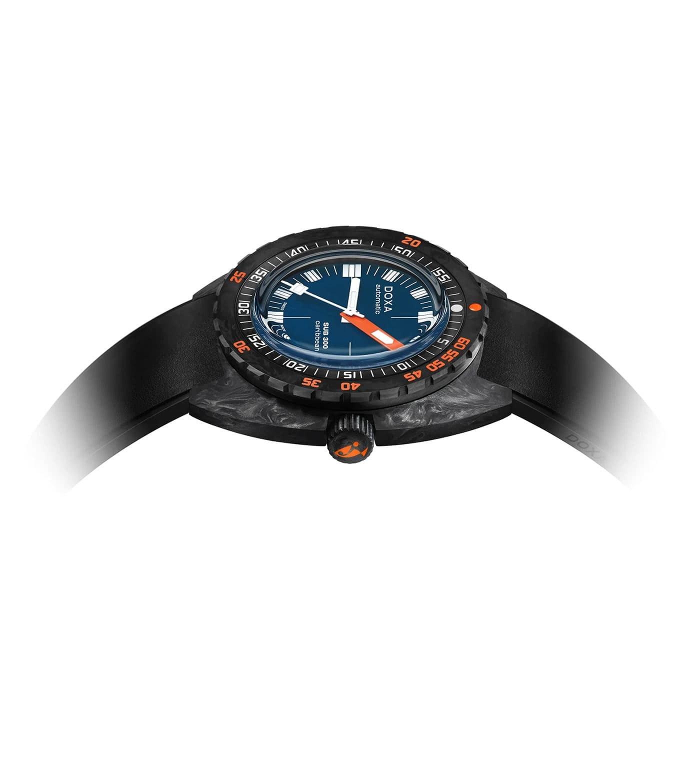 Doxa SUB 300 CARBON jsou ultralehké, profesionální náramkové diverské hodinky nabízející fascinující spojení nejmodernější technologie a estetiky přenesené z legendárního a převratného modelu SUB 300. s vysoce funkčním ciferníkem a barevně sladěným pryžovým páskem FKM.
