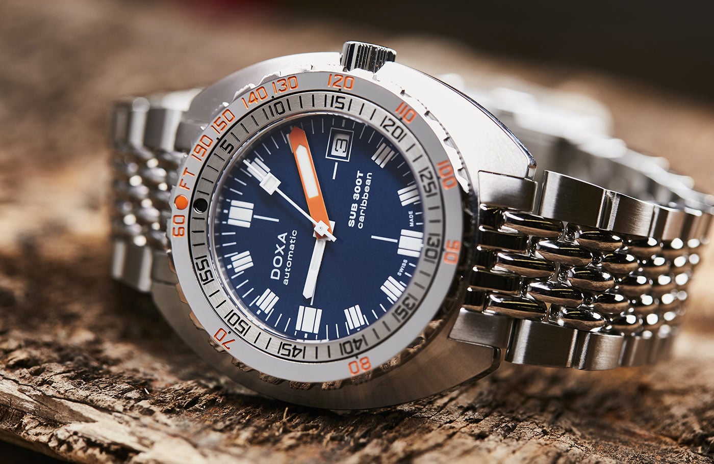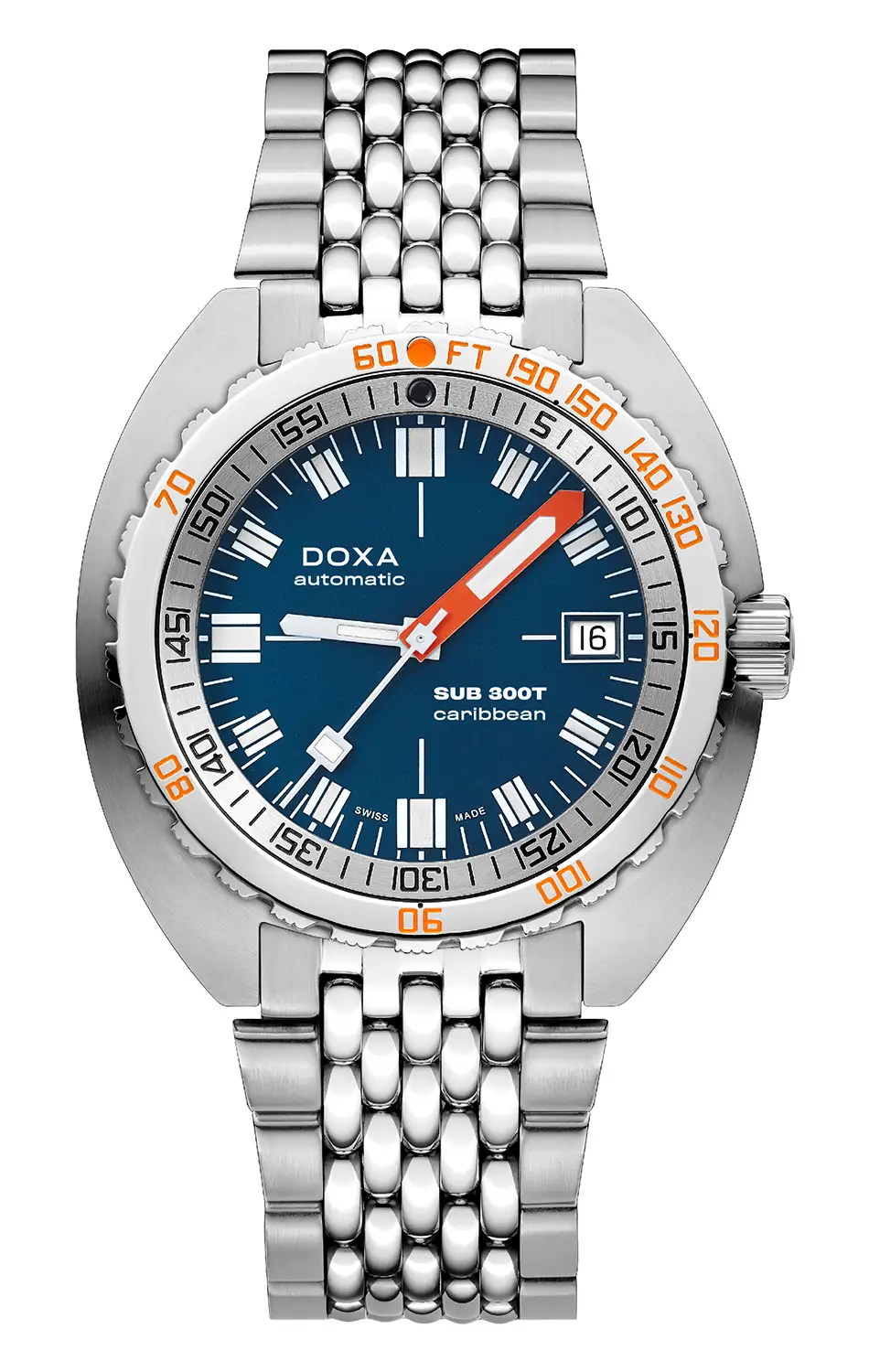 Automatické tříručičkové diverské hodinky Doxa Caribbean 840.10.201.10 kombinují estetické geny SUB 300T Conquistador s technickými vylepšeními, které definují dnešní vysoce výkonné diverské hodinky. SUB 300T je vyroben z nerezové oceli 316L a má průměr 42,5 mm a je vybaven safírovým sklem odolným proti poškrábání s antireflexní vrstvou. Leštěný a kartáčovaný prodlužovací náramek ve stylu „samostatných rýžových korálků“ je přišroubován, aby bylo zajištěno bezpečné uchycení. Náramkové diverské hodinky Doxa SUB 300T se zapínají na zápěstí skládací sponou, která umožňuje jejich přizpůsobení zápěstí v diverském obleku. Sponu a šroubovací korunku zdobí exkluzivní logo ryby DOXA. Celek pohání automatický švýcarský mechanický Machineek s rezervou chodu až 38 hodin .