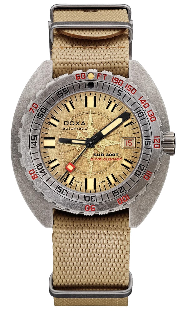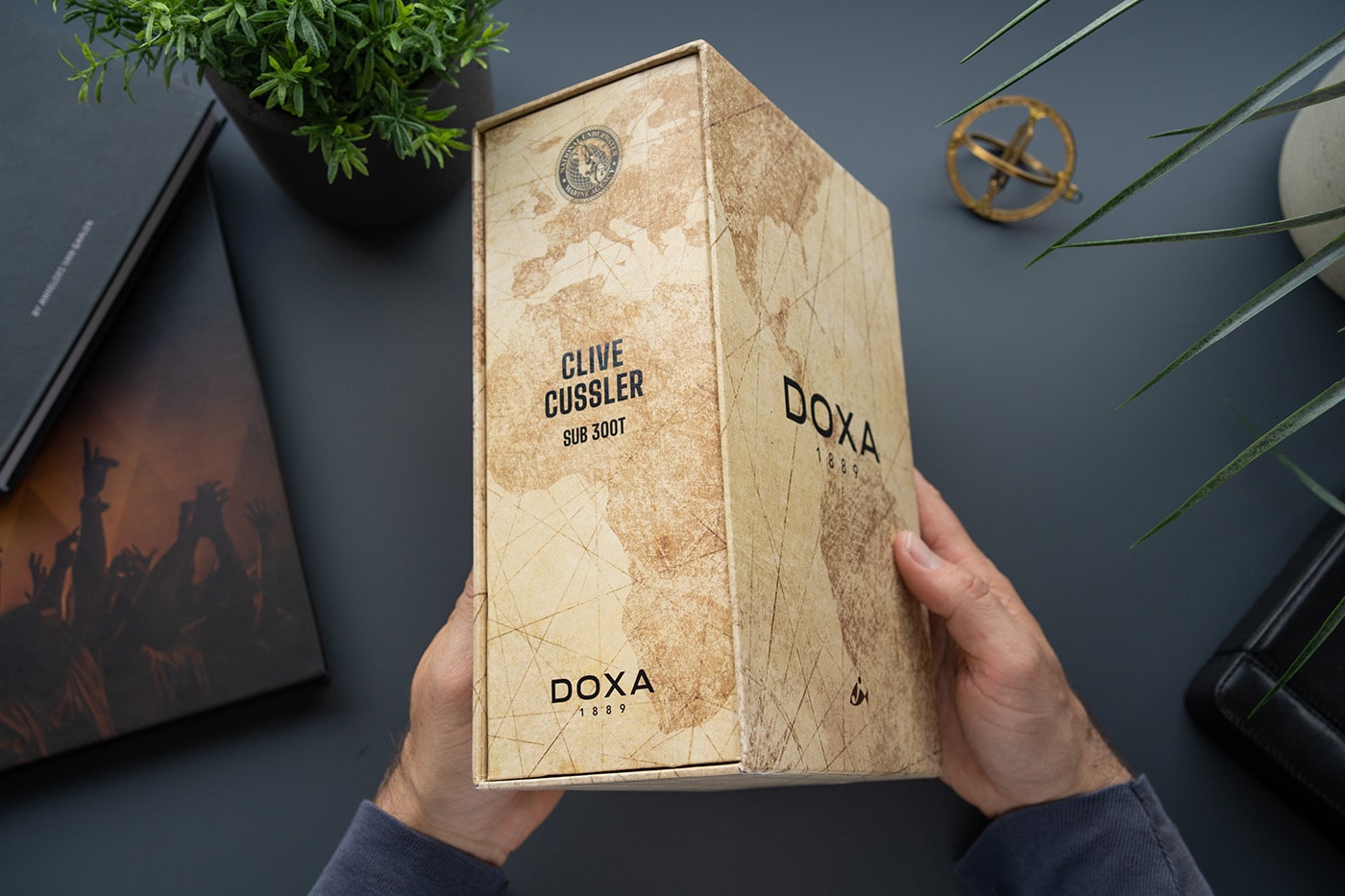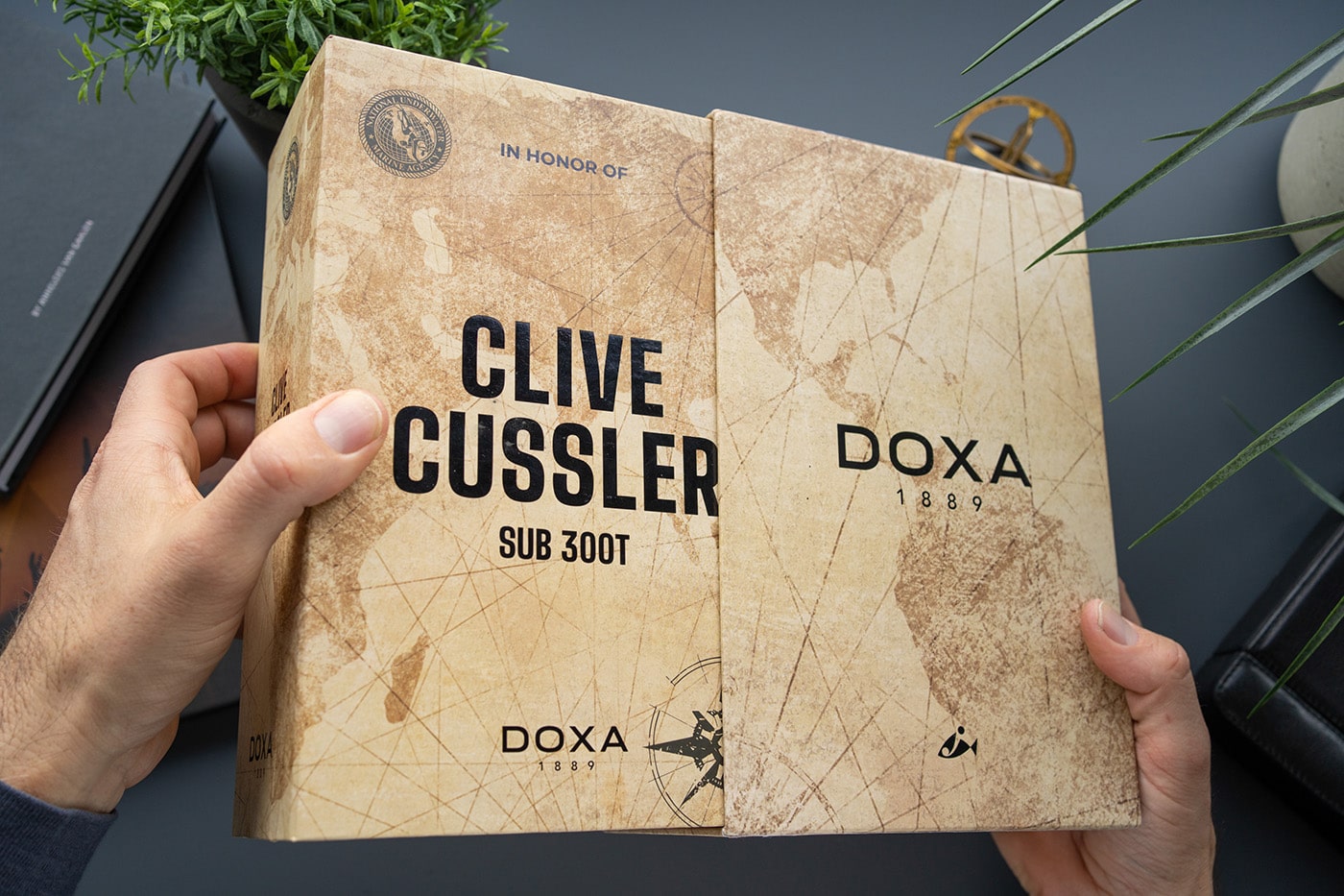 Vintage diverské hodinky Doxa SUB 300T Clive Cussler zůstávají věrné základním prvkům kolekce a zároveň udivují svými jedinečnými vlastnostmi. S originálním ručně vyrobeným ciferníkem připomínajícím staromódní kompas a použitím staré oceli na hodinkách, náramku, sponě a přezce je produkt navržen tak, aby měl zvětralý vzhled. Díky tomu je ideální pro nošení dobrodruhy v jednom z Cusslerových románů. Efekt stárnutí těchto hodinek je odrazem cesty plachetního artefaktu a podmínek, za kterých byl ponořen do propasti.