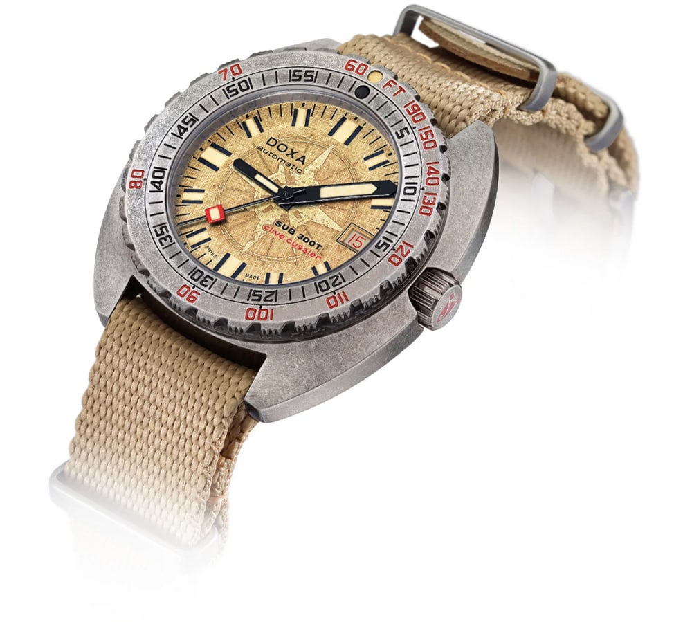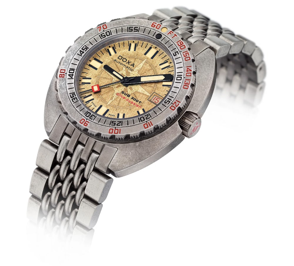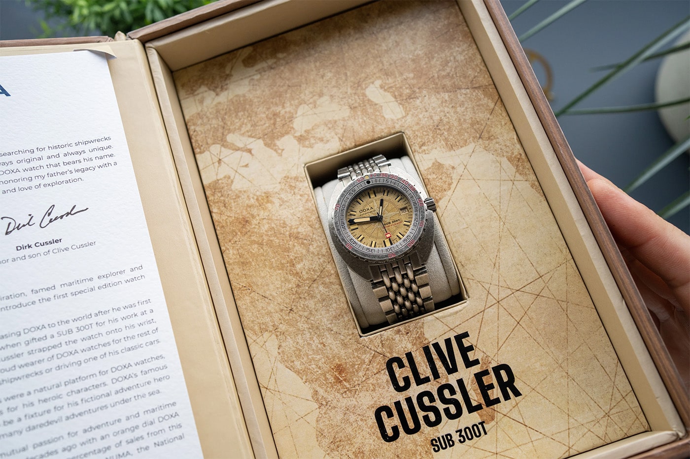 Diverské hodinky Doxa SUB 300T Clive Cussler jsou speciální model, který ztělesňuje dobrodružného ducha děl Cliva Cusslera. Má ručně vyrobený ciferník , který připomíná starý kompas a vzhled starožitné oceli. Vodotěsnost do 300 m, hodinky připomínají narozeniny autora s datumy 7, 15 a 31 zobrazenými na číselníku v červeném odstínu. Ať už se nosí na souši nebo na moři, představuje nezdolného ducha průzkumu a dobrodružství.