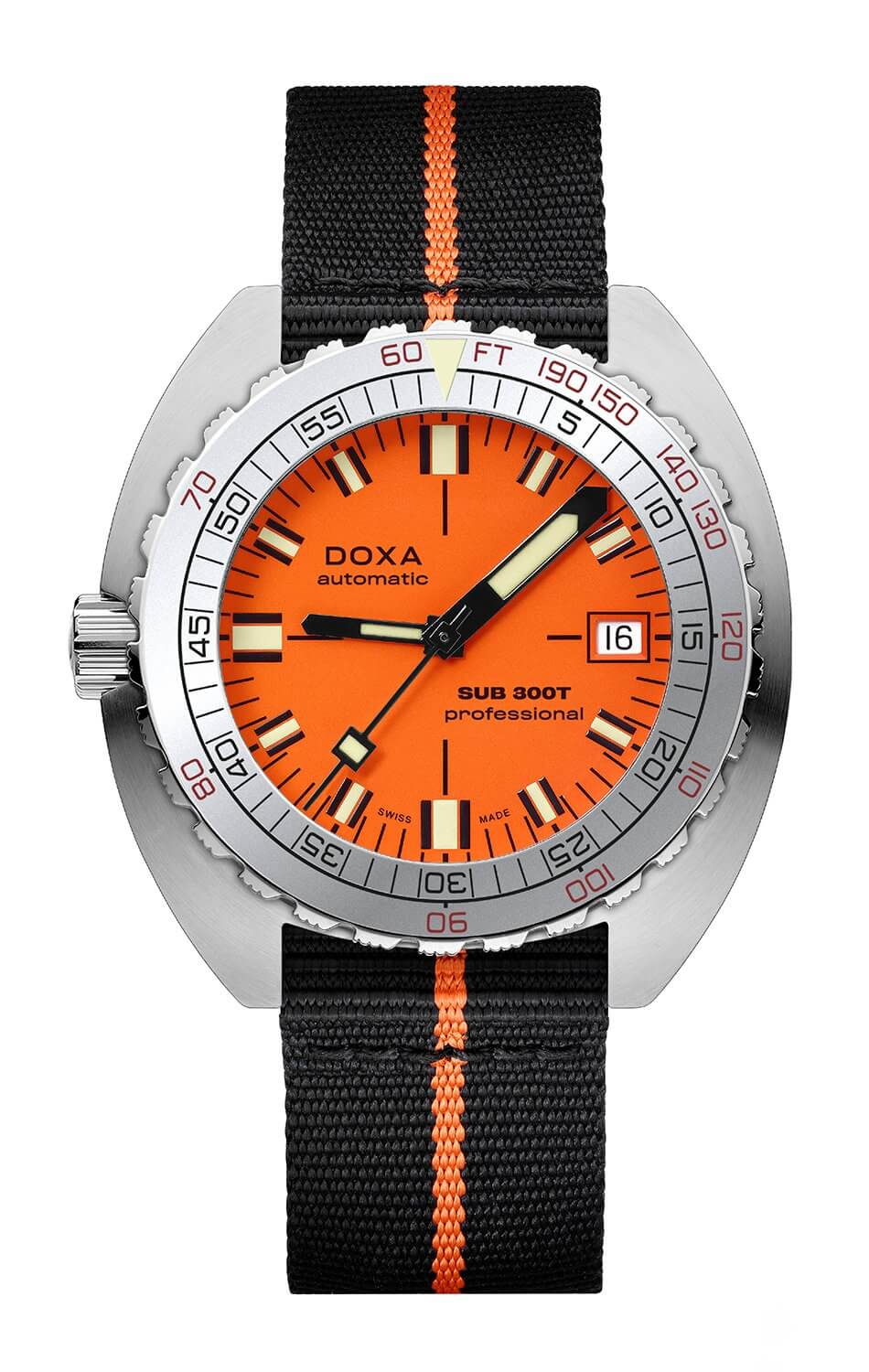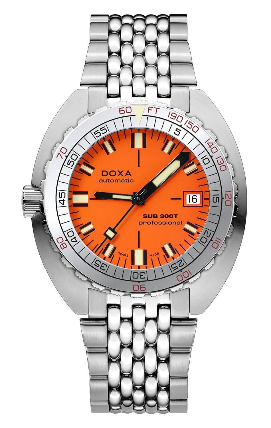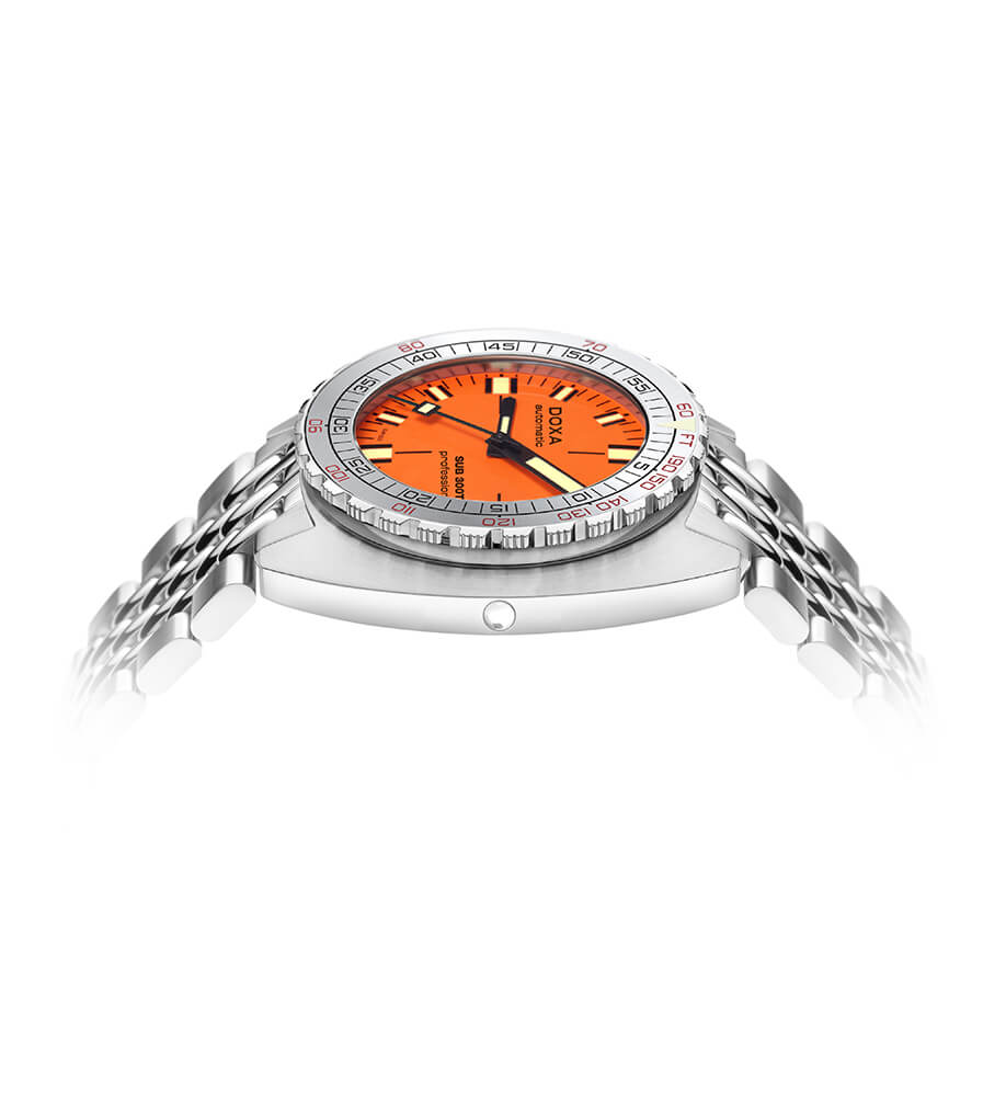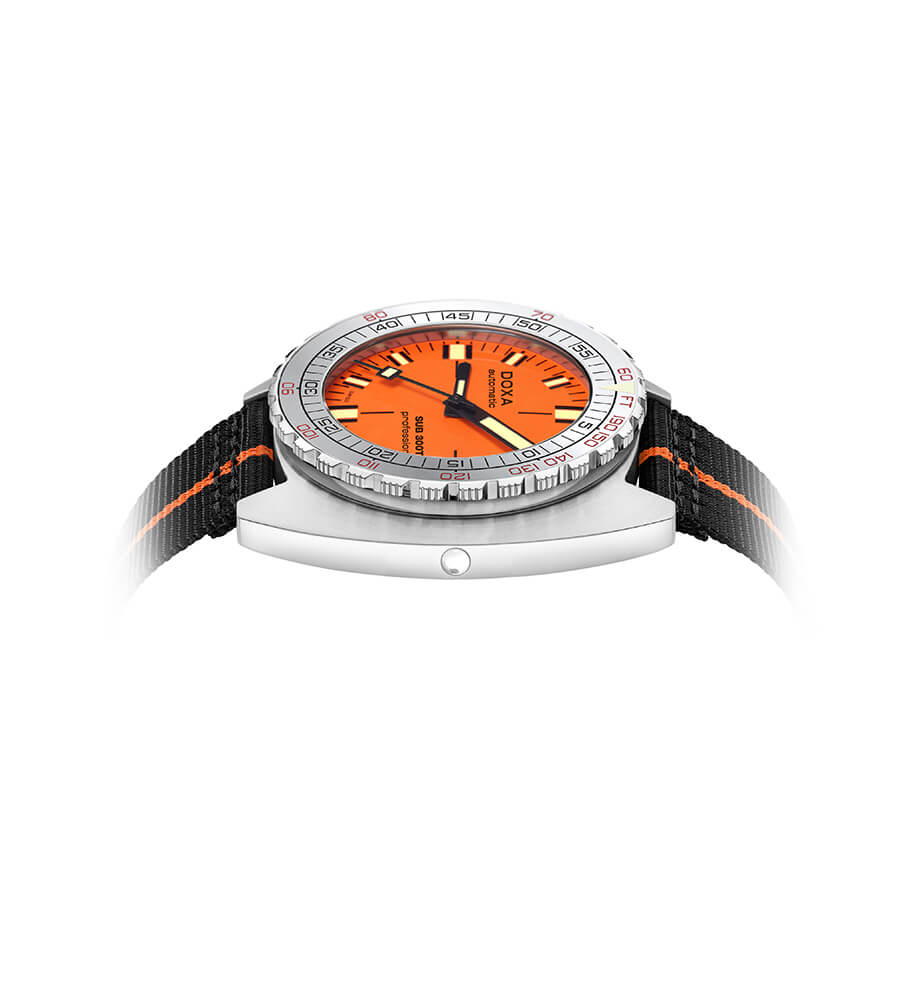 Potápěčské hodinky SUB 300T Professional Aristera jsou vybaveny ventilem na uvolnění helia a jednobarevným bezelem s hliníkovou vložkou, který umožňuje přesné výpočty potápěčských časů bez dekomprese. Design bezelu odkazuje na klasické vzory zavedené Aubry Frères v 80. letech. Pouzdro o rozměrech 42,50 mm x 44,50 mm a tloušťce 13,65 mm je vyrobeno z nerezové oceli 316L, která zajišťuje výjimečnou odolnost vůči korozi, a safírové sklo s antireflexní vrstvou účinně chrání ciferník. Všechny potápěčské ukazatele jsou pokryty luminescenčním materiálem Super-LumiNova®, což zajišťuje vynikající čitelnost i za obtížných světelných podmínek. Díky spojení technické dokonalosti a rafinované estetiky, Doxa SUB 300T Aristera Professional je ideální volbou pro profesionální i amatérské potápěče.
