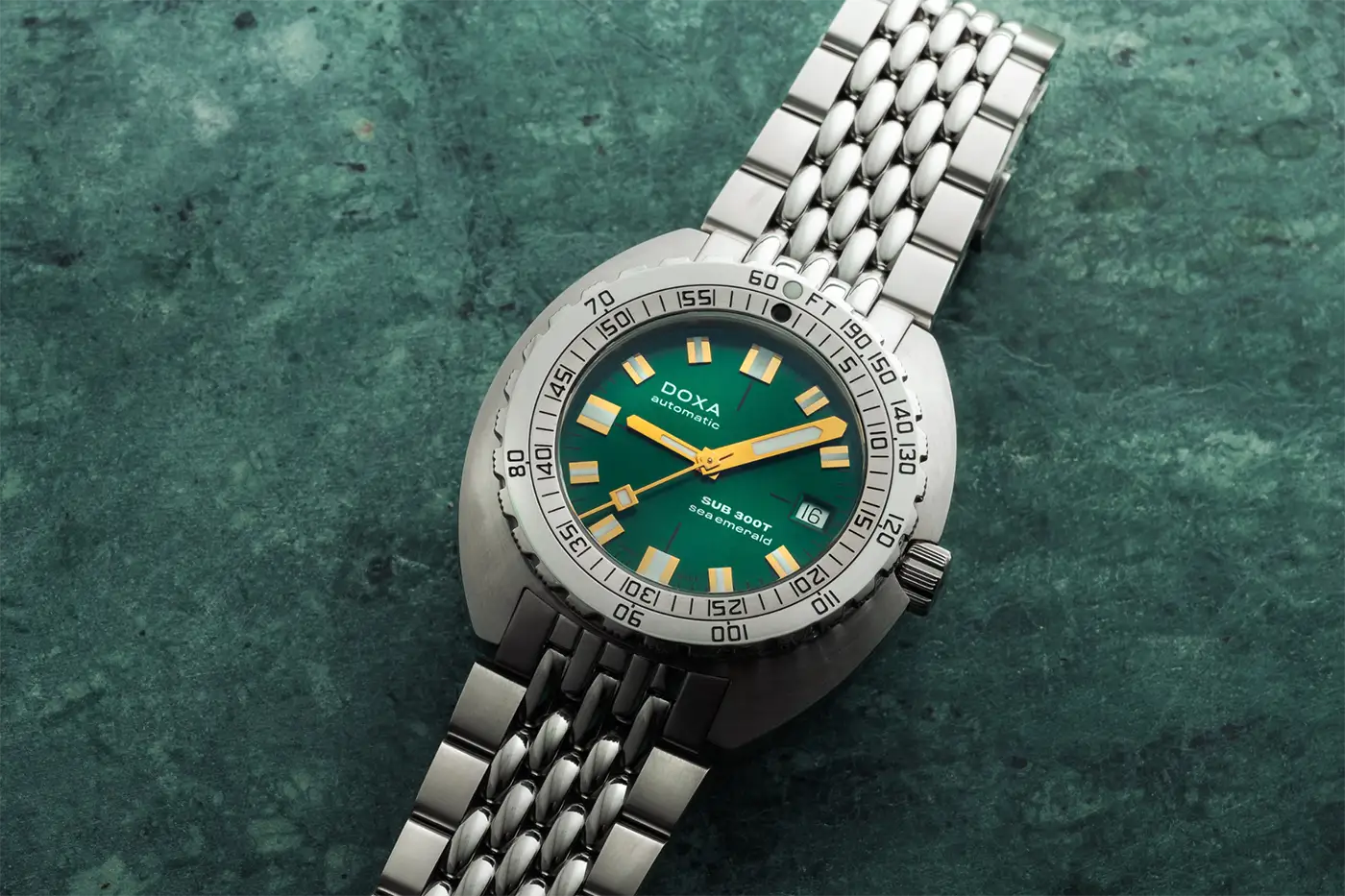 Profesionální potápěčské hodinky Doxa SUB 300T Sea Emerald 840.10.131.10 jsou moderní interpretací legendárního modelu SUB 300T Conquistador, který v roce 1968 jako první představil široké veřejnosti inovativní funkce, jako je heliový ventil. Nová verze, představená v září 2019, vzdává hold originálu tím, že kombinuje klasickou estetiku s moderními technologickými vylepšeními. V roce 2024, během Geneva Watch Days, Doxa vyhlásila živou barvu „Sea Emerald“ jako osmou oficiální barvu v rodině SUB, což rozšířilo kolekci SUB 300T o nový odstín ciferníku, který dokonale odráží ducha mořského dobrodružství a zdůrazňuje jedinečné spojení značky s oceány.