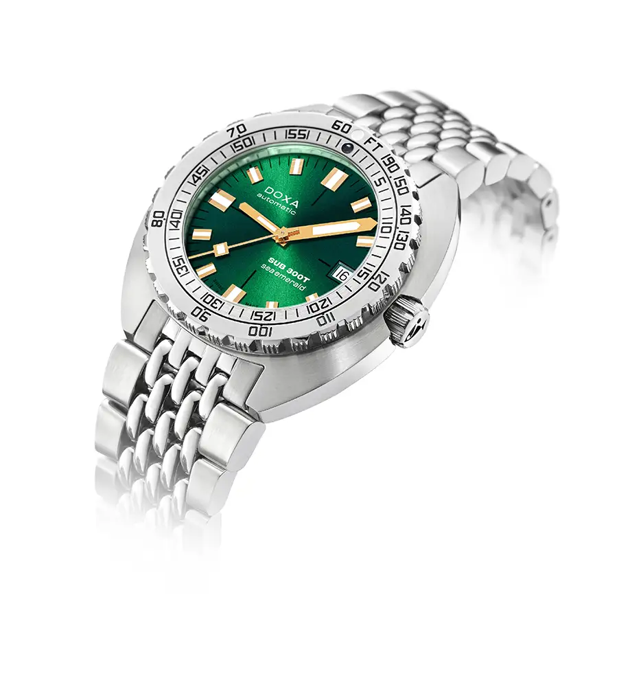 Díky novému sunburst provedení ciferníku, který efektně odráží světlo, a zlatým akcentům spojuje tento model ducha dobrodružství s vytříbeností. Doxa SUB 300T Sea Emerald nejen připomíná legendární originál, ale také otevírá novou kapitolu v historii značky a nabízí milovníkům potápění a sběratelům hodinek moderní, stylové a funkční řešení. Hodinky pohání švýcarský automatický strojek, který zajišťuje rezervu chodu přibližně 38 hodin s vysokou frekvencí 28800 vph (4,0 Hz). Strojek je zdobený společností DOXA, což dále podtrhuje jeho kvalitu. Náramek s charakteristickou konstrukcí „Beads of Rice“ je vyroben z kvalitní nerezové oceli 316L a je vybaven skládacím zapínáním s prodloužením pro pěnu a symbolem ryby DOXA.