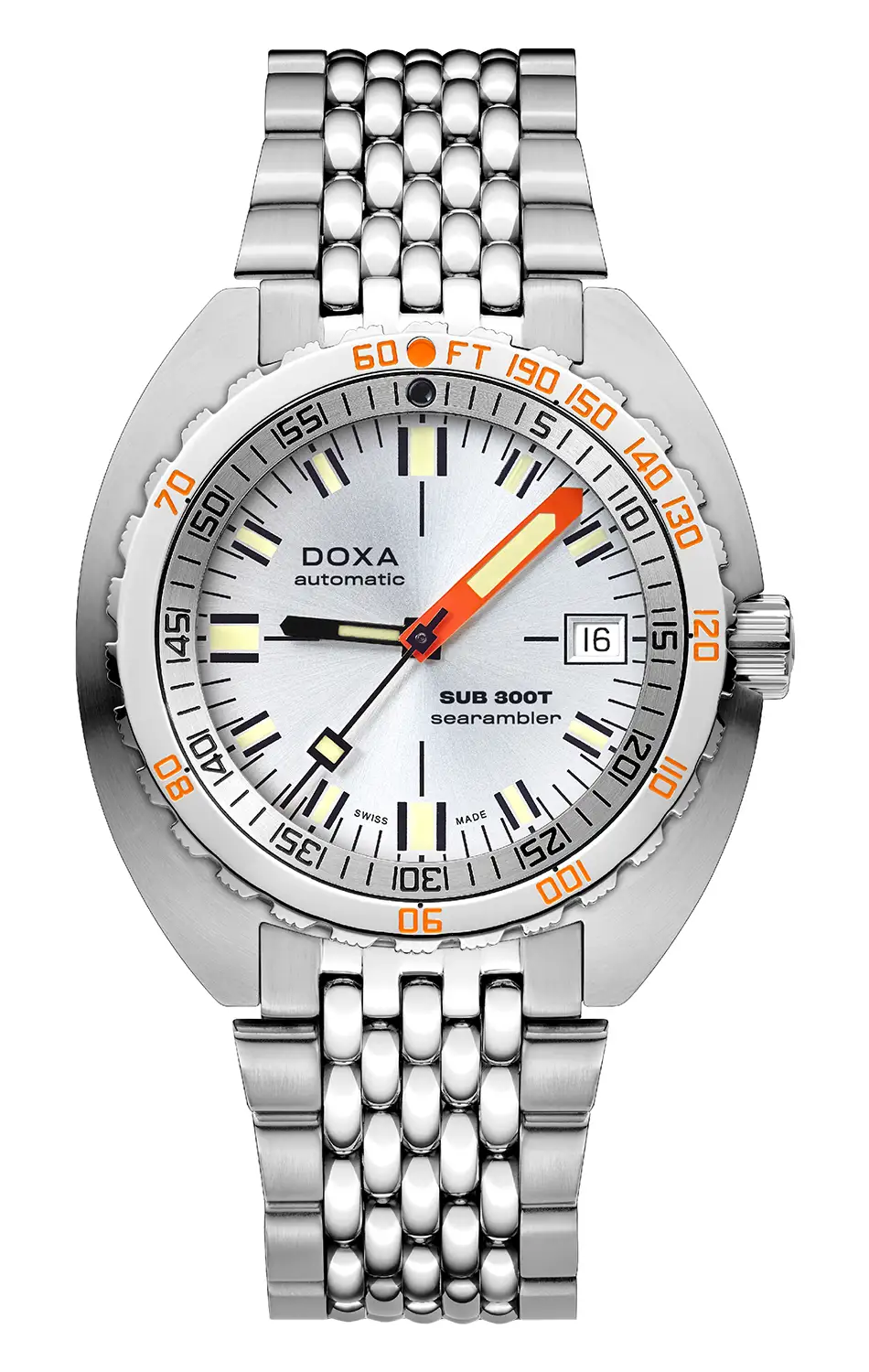 Automatické tříručičkové diverské hodinky Doxa Searambler 840.10.021.10 kombinují estetické geny SUB 300T Conquistador s technickými vylepšeními, které definují dnešní vysoce výkonné diverské hodinky. SUB 300T je vyroben z nerezové oceli 316L a má průměr 42,5 mm a je vybaven safírovým sklem odolným proti poškrábání s antireflexní vrstvou. Leštěný a kartáčovaný prodlužovací náramek ve stylu „samostatných rýžových korálků“ je přišroubován, aby bylo zajištěno bezpečné uchycení. Náramkové diverské hodinky Doxa SUB 300T se zapínají na zápěstí skládací sponou, která umožňuje jejich přizpůsobení zápěstí v diverském obleku. Sponu a šroubovací korunku zdobí exkluzivní logo rybičky DOXA. Celek pohání automatický švýcarský mechanický Machineek s rezervou chodu až 38 hodin .