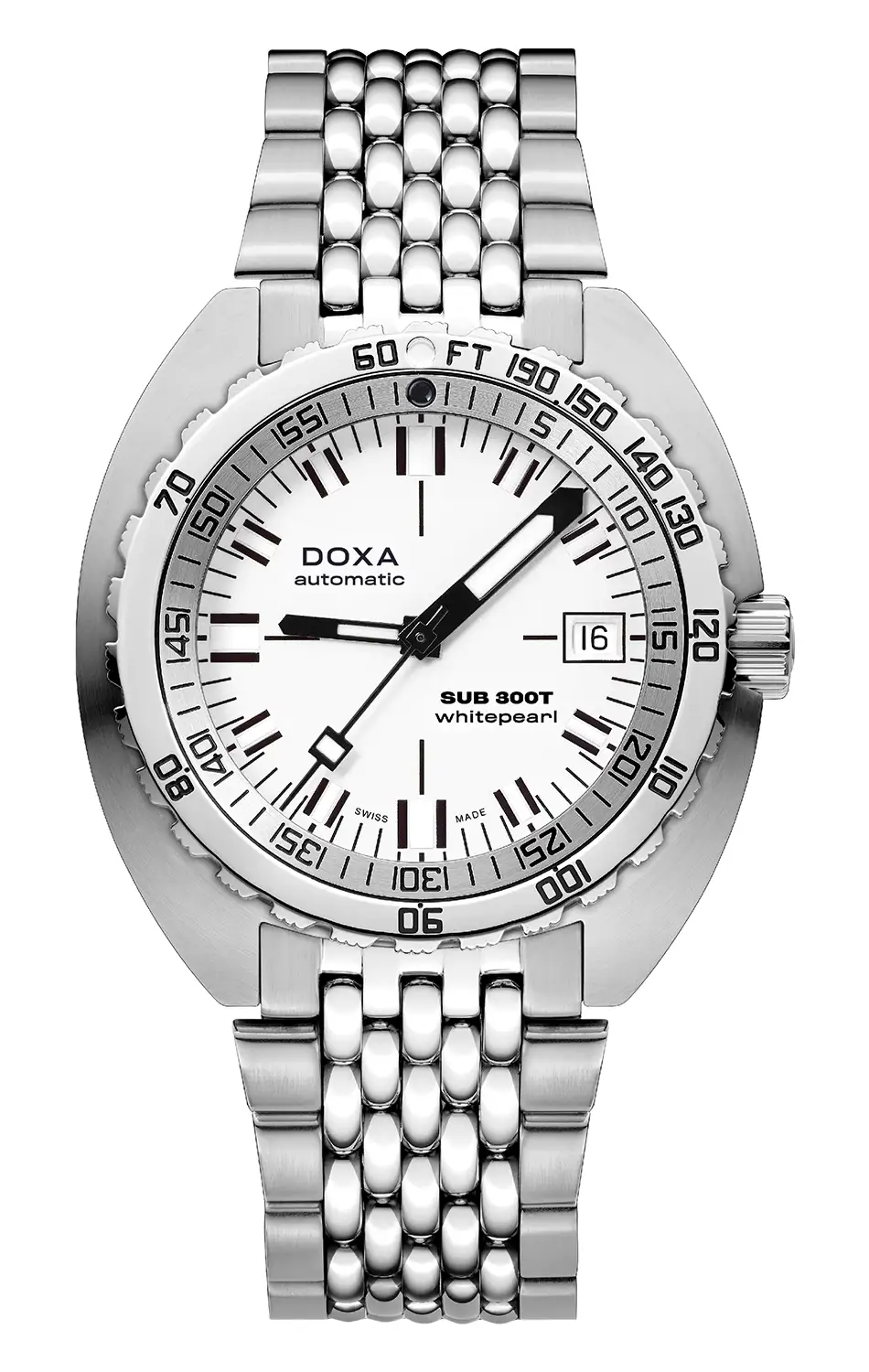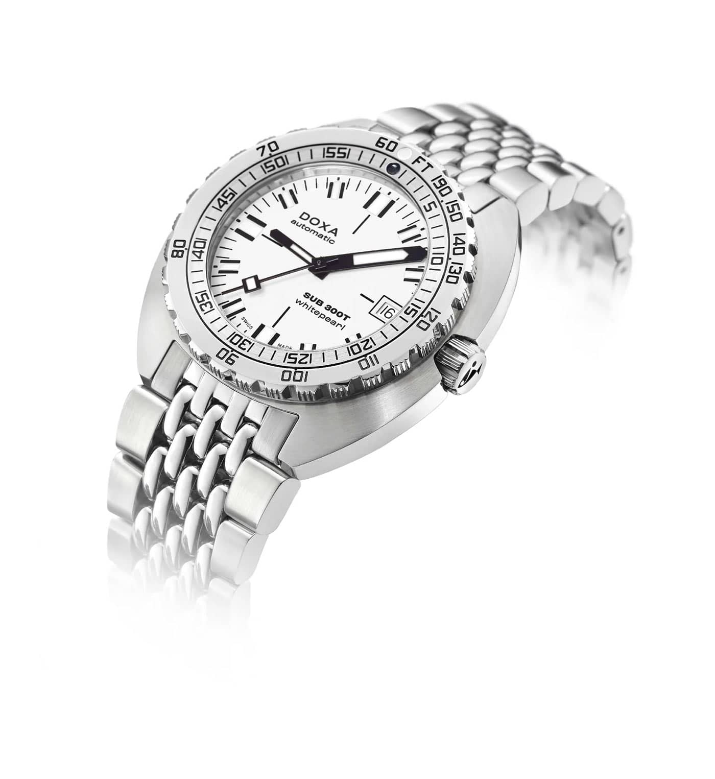 Automatické tříručičkové diverské hodinky Doxa Whitepearl 840.10.011.10 kombinují estetické geny SUB 300T Conquistador s technickými vylepšeními, které definují dnešní vysoce výkonné diverské hodinky. SUB 300T je vyroben z nerezové oceli 316L a má průměr 42,5 mm a je vybaven safírovým sklem odolným proti poškrábání s antireflexní vrstvou. Leštěný a kartáčovaný prodlužovací náramek ve stylu „samostatných rýžových korálků“ je přišroubován, aby bylo zajištěno bezpečné uchycení. Náramkové diverské hodinky Doxa SUB 300T se zapínají na zápěstí skládací sponou, která umožňuje jejich přizpůsobení zápěstí v diverském obleku. Sponu a šroubovací korunku zdobí exkluzivní logo rybičky DOXA. Celek pohání automatický švýcarský mechanický Machineek s rezervou chodu až 38 hodin .
