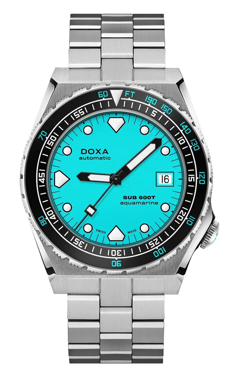 DOXA SUB 600T je znovuzrozena v roce 2021 – o více než 40 let později a dokáže víc než jen znovu navštívit kapitolu napsanou dávno. Značka vzdává hold ikonickému modelu SUB 600T novým příběhem, který právě vzniká. Po velkém úspěchu limitované edice titanových diverských hodinek Doxa SUB 600T Pacific Blue představuje DOXA SUB 600T v neomezené verzi, aby obohatila řadu profesionálních diverských hodinek DOXA SUB. Znovuzrozené diverské hodinky Doxa SUB 600T Aquamarine jsou model dostupný v odolném pouzdře z nerezové oceli 316L s černým keramickým rámečkem , uprostřed kterého je dobře čitelný tyrkysový číselník.