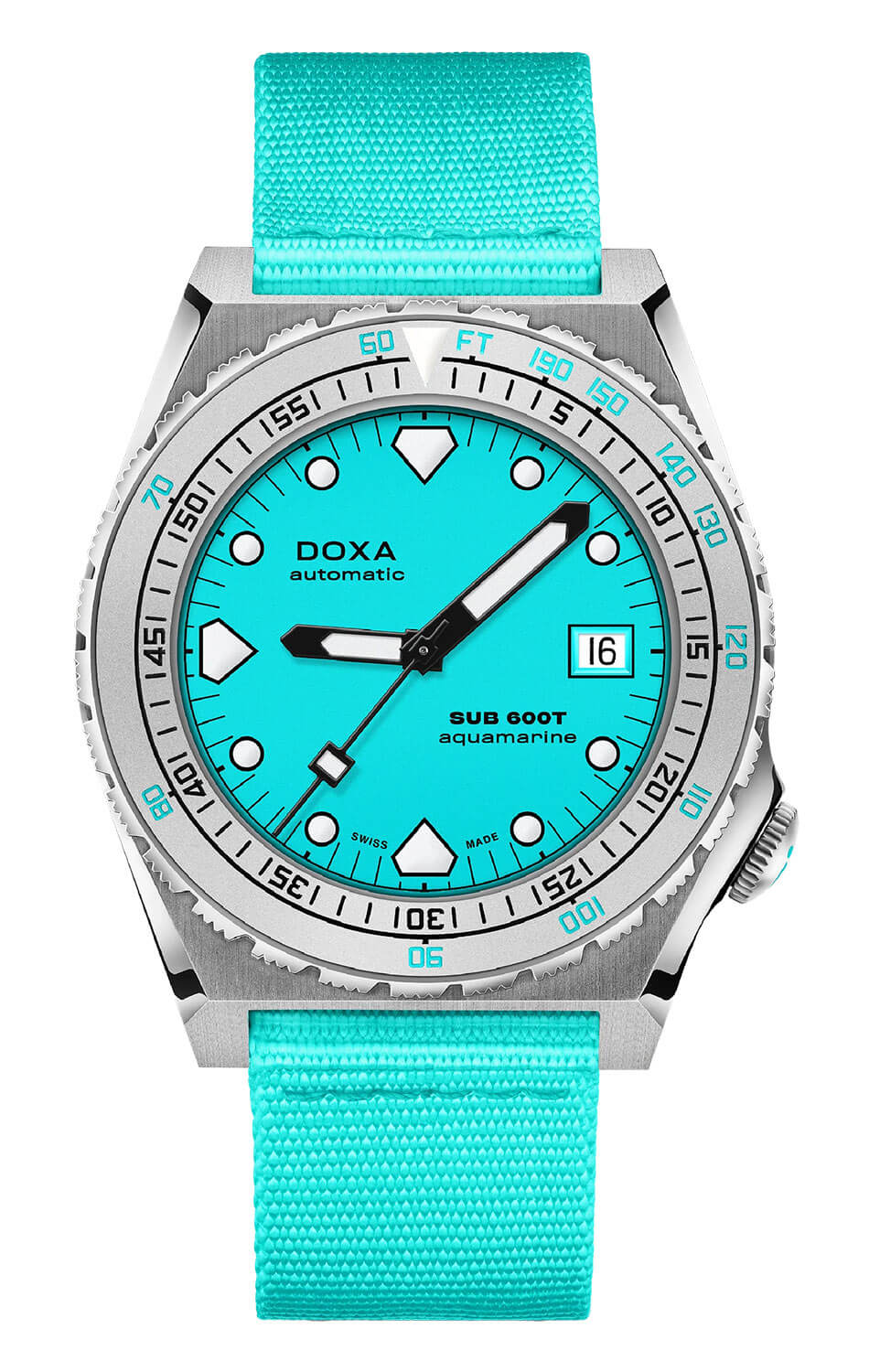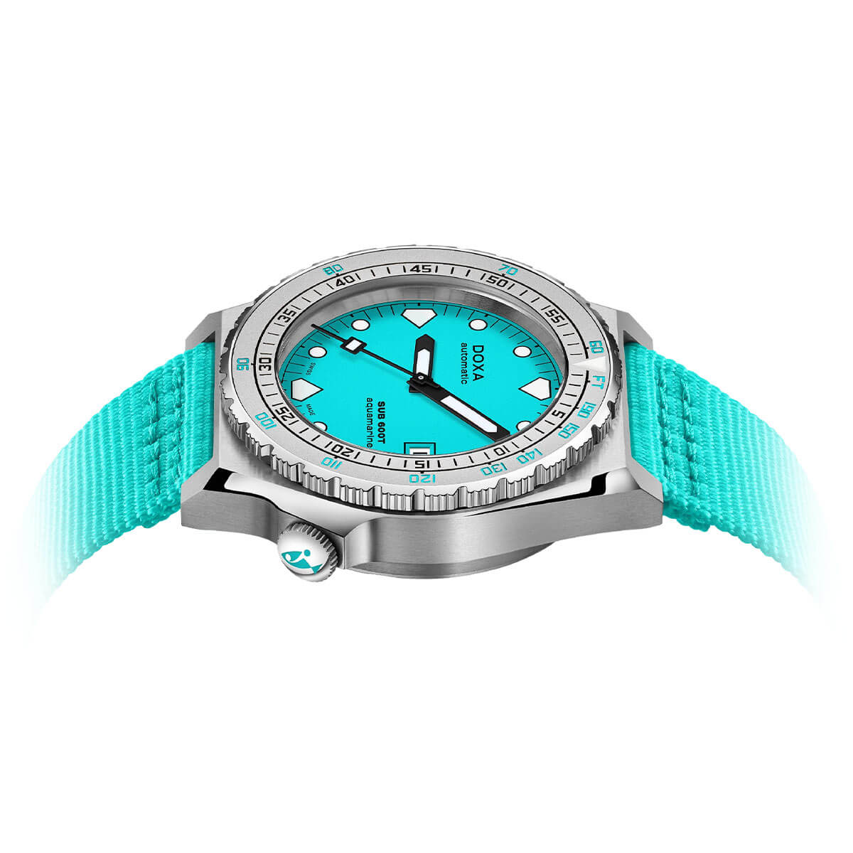Každý prvek modelu Doxa SUB 600T Aquamarine NATO byl navržen tak, aby obstál ve výzvách hlubin. Pouzdro o průměru 40 mm je vyrobeno z nerezové oceli 316L, odolné proti korozi, což zajišťuje vysokou odolnost i v náročných podmínkách námořních expedic. Pod safírovým sklem se nachází výrazný ciferník ve světle modré barvě. Jeho velké indexy a ručičky jsou pokryty luminiscenční vrstvou Super-LumiNova® – včetně charakteristických žraločích zubů na pozicích 6, 9 a 12 – což zaručuje vynikající čitelnost ve tmě i pod vodou. Jednosměrná otočná potápěčská luneta s minutovými a hloubkovými značkami umožňuje snadné a přesné měření doby ponoru a bezpečné plánování výstupu bez dekomprese. Toto řešení odkazuje na původní patent Doxy, který pomáhal potápěčům bezpečně se vrátit na hladinu. Díky šroubovací korunce (umístěné netradičně na 4. hodině) a robustní konstrukci zůstávají hodinky vodotěsné až do 600 metrů (60 ATM), což uživateli poskytuje jistotu a vysokou rezervu bezpečnosti nad běžné standardy.