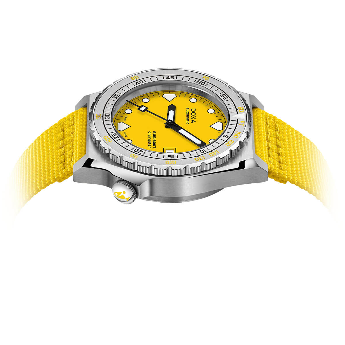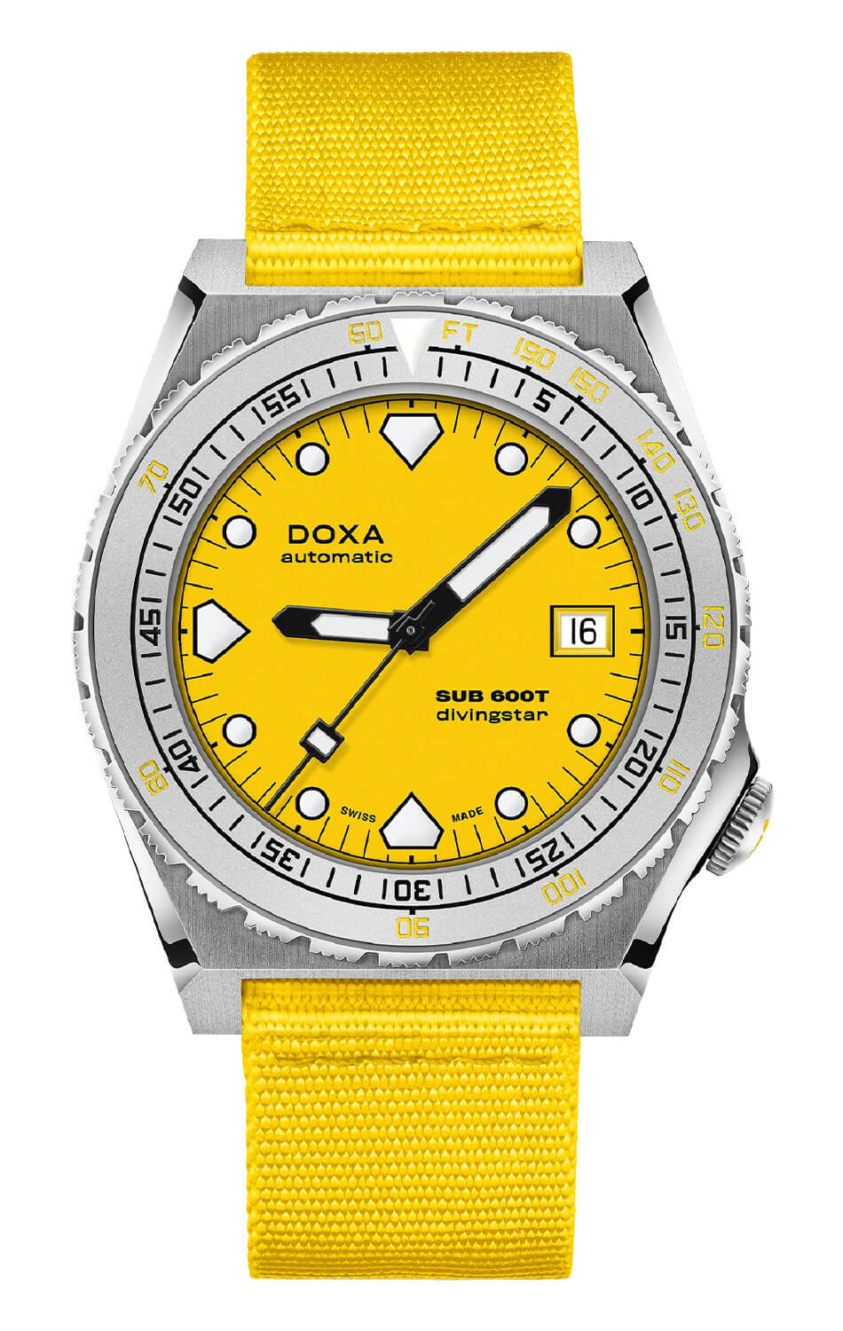 Každý prvek modelu Doxa SUB 600T Divingstar NATO byl navržen tak, aby obstál ve výzvách hlubin. Pouzdro o průměru 40 mm je vyrobeno z nerezové oceli 316L, odolné proti korozi, což zajišťuje vysokou odolnost i v náročných podmínkách námořních expedic. Pod safírovým sklem se nachází výrazný ciferník v žluté barvě. Jeho velké indexy a ručičky jsou pokryty luminiscenční vrstvou Super-LumiNova® – včetně charakteristických žraločích zubů na pozicích 6, 9 a 12 – což zaručuje vynikající čitelnost ve tmě i pod vodou. Jednosměrná otočná potápěčská luneta s minutovými a hloubkovými značkami umožňuje snadné a přesné měření doby ponoru a bezpečné plánování výstupu bez dekomprese. Toto řešení odkazuje na původní patent Doxy, který pomáhal potápěčům bezpečně se vrátit na hladinu. Díky šroubovací korunce (umístěné netradičně na 4. hodině) a robustní konstrukci zůstávají hodinky vodotěsné až do 600 metrů (60 ATM), což uživateli poskytuje jistotu a vysokou rezervu bezpečnosti nad běžné standardy.