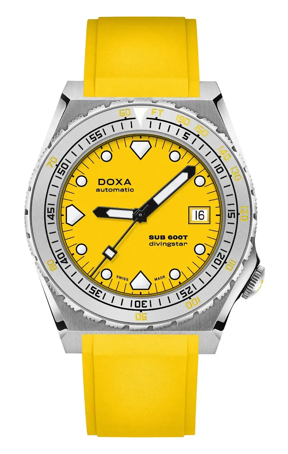 DOXA SUB 600T je znovuzrozena v roce 2021 – o více než 40 let později a dokáže víc než jen znovu navštívit kapitolu napsanou dávno. Značka vzdává hold ikonickému modelu SUB 600T novým příběhem, který právě vzniká. Po velkém úspěchu limitované edice titanových diverských hodinek Doxa SUB 600T Pacific Blue představuje DOXA SUB 600T v neomezené verzi, aby obohatila řadu profesionálních diverských hodinek DOXA SUB. Znovuzrozené diverské hodinky Doxa SUB 600T Divingstar jsou model dostupný v odolném pouzdře z nerezové oceli 316L, se žlutým páskem z kvalitní FKM pryže a rámem z pískované oceli se snadno čitelným žlutým ciferníkem uvnitř.