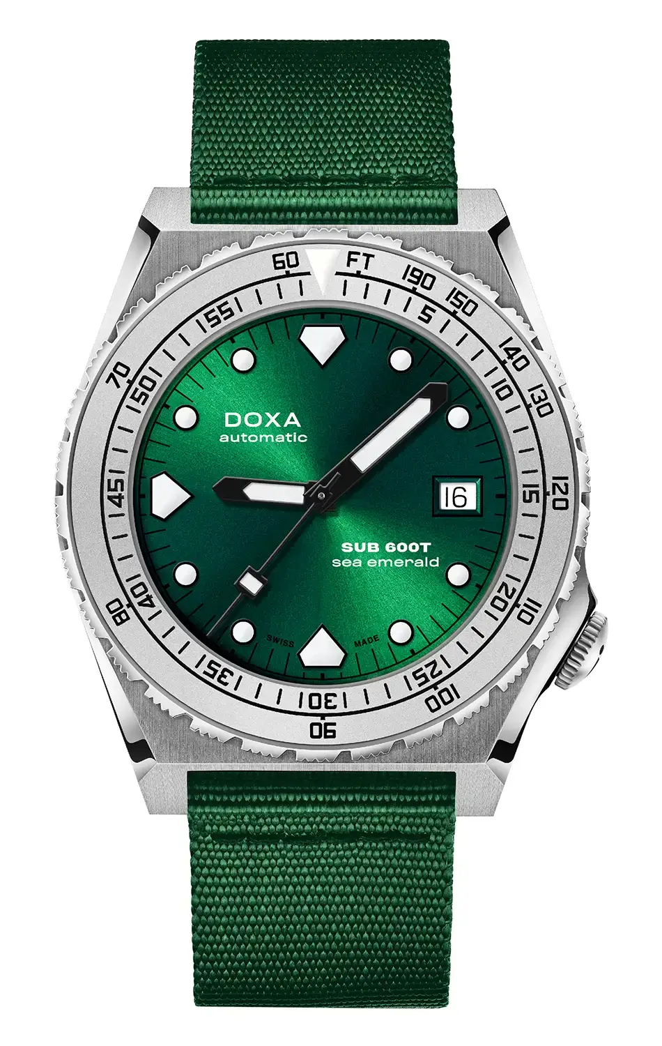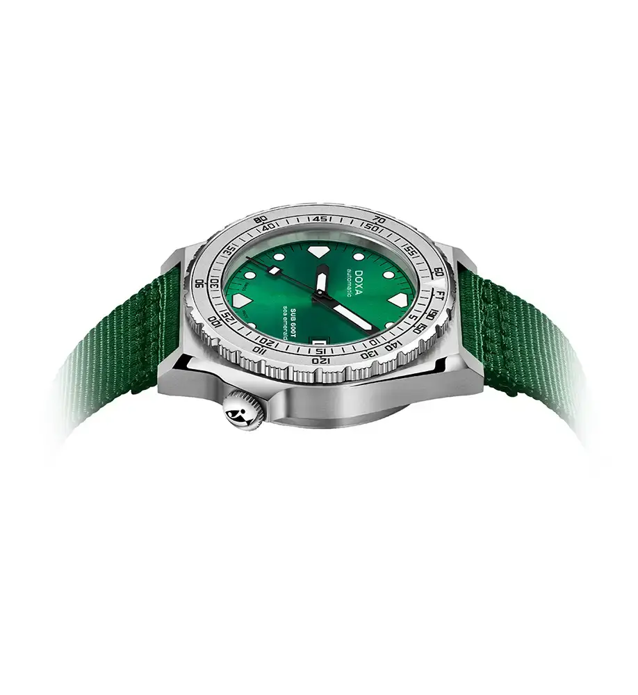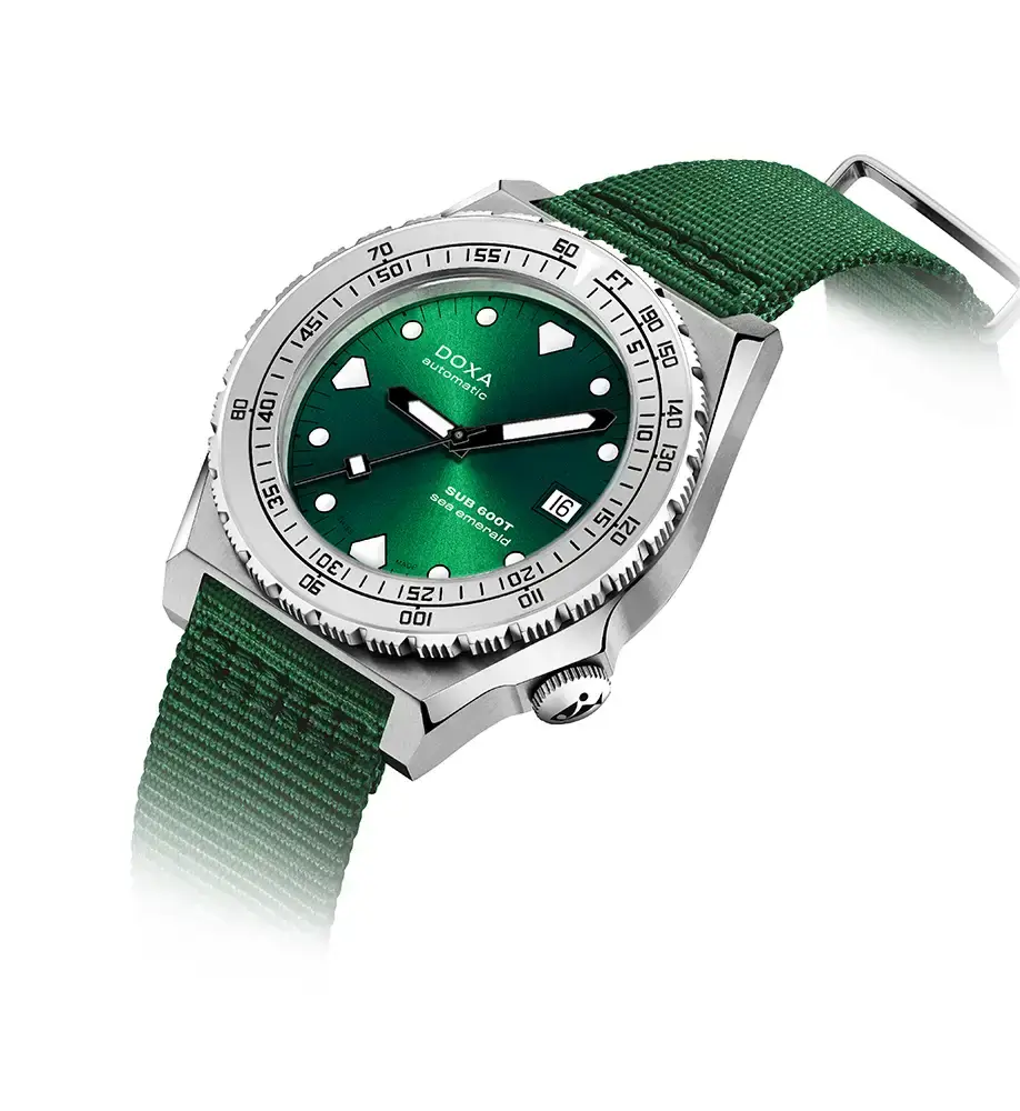 DOXA SUB 600T Sea Emerald 862.10.131.26-N jsou profesionální potápěčské hodinky, které věrně zachovávají ikonický styl 80. let, zároveň však splňují současné požadavky potápěčů i milovníků odolných časoměrů. SUB 600T Sea Emerald, vyznačující se klasickým designem DOXA, přináší novinku v podobě ciferníku a pásku v odstínu Sea Emerald s elegantní úpravou sunburst, která krásně odráží světlo a vytváří hypnotizující světelné efekty. Tento hluboký, mořský odstín zelené symbolizuje spojení DOXA s oceány a vyvolává obrazy vln a podmořských scenérií z různých koutů světa.