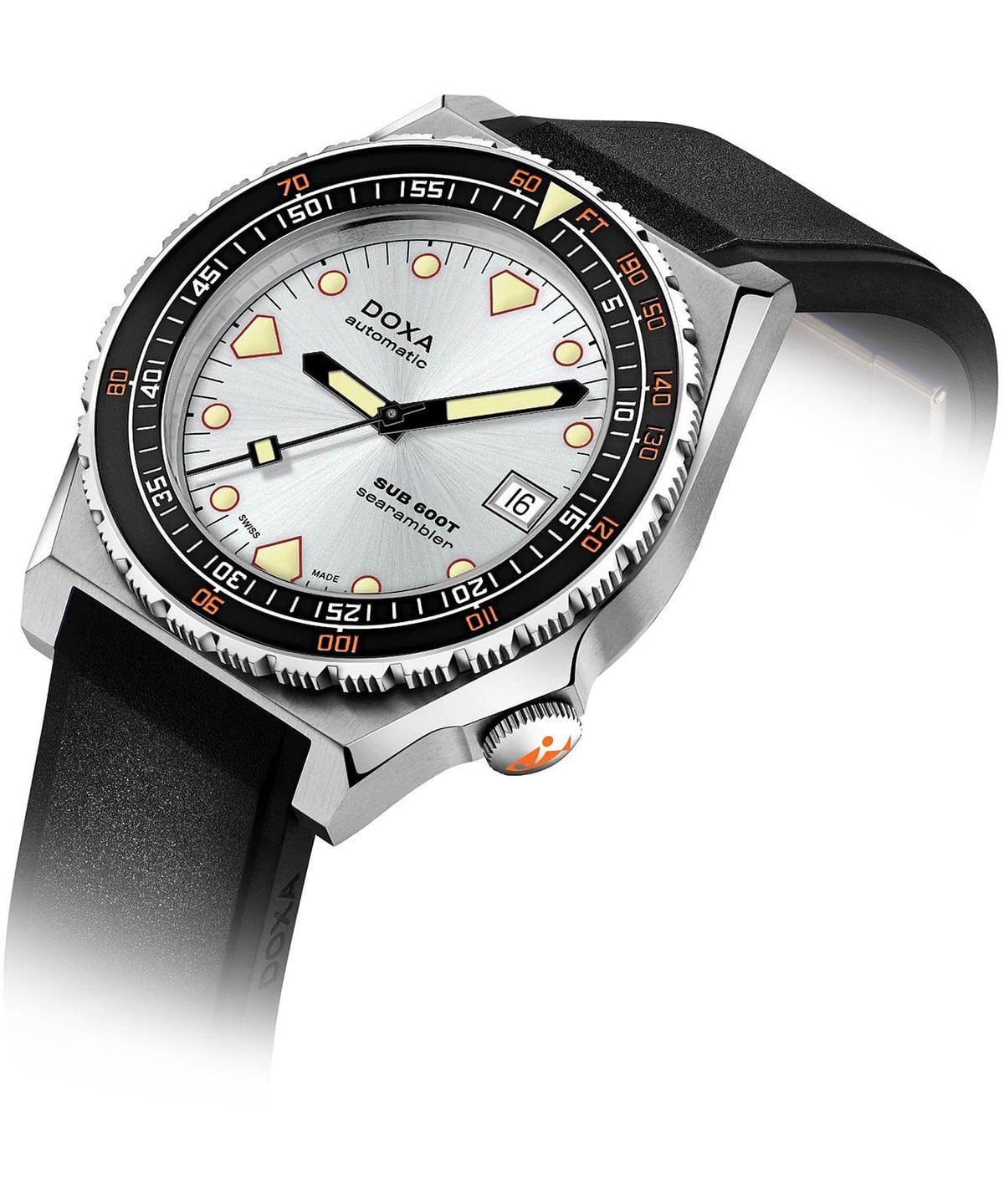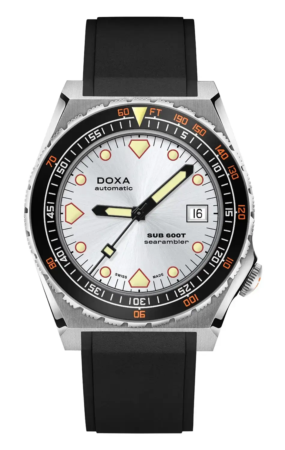 DOXA SUB 600T je znovuzrozena v roce 2021 – o více než 40 let později a dokáže víc než jen znovu navštívit kapitolu napsanou dávno. Značka vzdává hold ikonickému modelu SUB 600T novým příběhem, který právě vzniká. Po velkém úspěchu limitované edice titanových diverských hodinek Doxa SUB 600T Pacific Blue představuje DOXA SUB 600T v neomezené verzi, aby obohatila řadu profesionálních diverských hodinek DOXA SUB. Znovuzrozené diverské hodinky Doxa SUB 600T Searambler jsou model dostupný v odolném pouzdře z nerezové oceli 316L, s černým páskem z kvalitní FKM pryže a keramickou lunetou se snadno čitelným leštěným ciferníkem uvnitř.