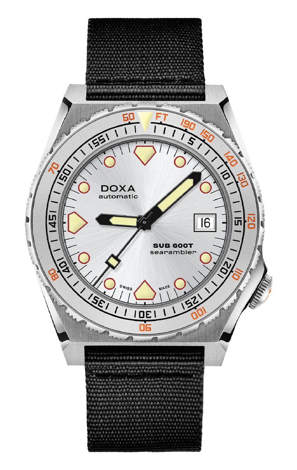 Každý prvek modelu Doxa SUB 600T Searambler NATO byl navržen tak, aby obstál ve výzvách hlubin. Pouzdro o průměru 40 mm je vyrobeno z nerezové oceli 316L, odolné proti korozi, což zajišťuje vysokou odolnost i v náročných podmínkách námořních expedic. Pod safírovým sklem se nachází výrazný světlý ciferník. Jeho velké indexy a ručičky jsou pokryty luminiscenční vrstvou Super-LumiNova® – včetně charakteristických žraločích zubů na pozicích 6, 9 a 12 – což zaručuje vynikající čitelnost ve tmě i pod vodou. Jednosměrná otočná potápěčská luneta s minutovými a hloubkovými značkami umožňuje snadné a přesné měření doby ponoru a bezpečné plánování výstupu bez dekomprese. Toto řešení odkazuje na původní patent Doxy, který pomáhal potápěčům bezpečně se vrátit na hladinu. Díky šroubovací korunce (umístěné netradičně na 4. hodině) a robustní konstrukci zůstávají hodinky vodotěsné až do 600 metrů (60 ATM), což uživateli poskytuje jistotu a vysokou rezervu bezpečnosti nad běžné standardy.