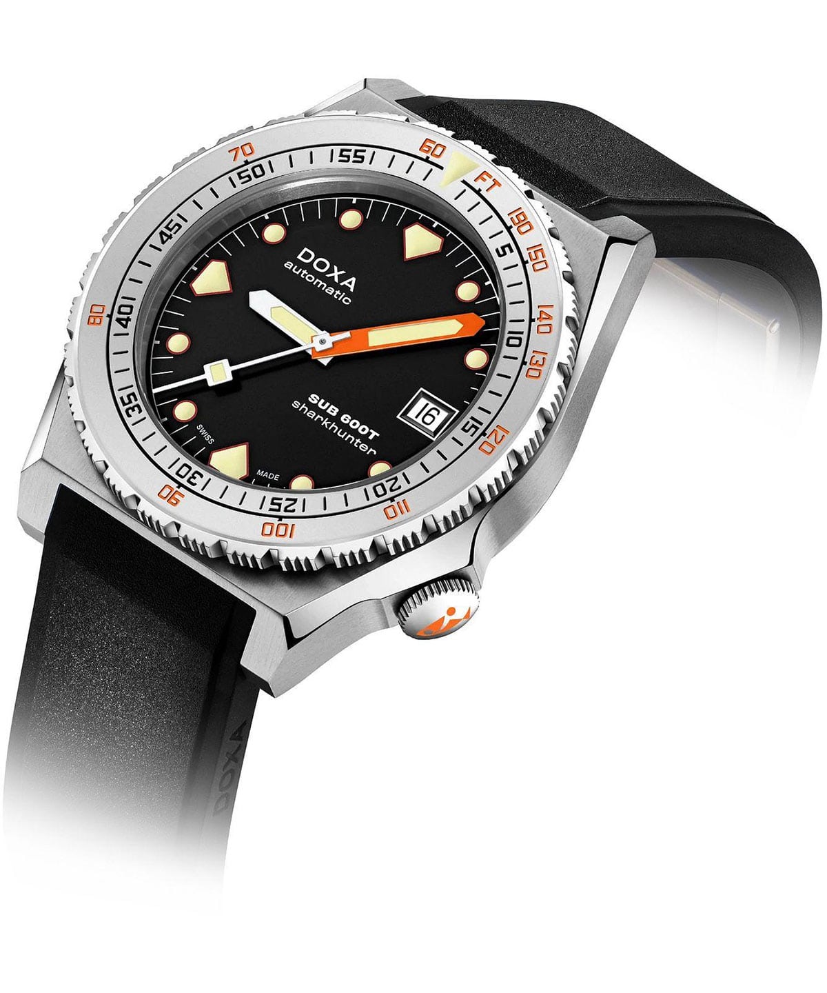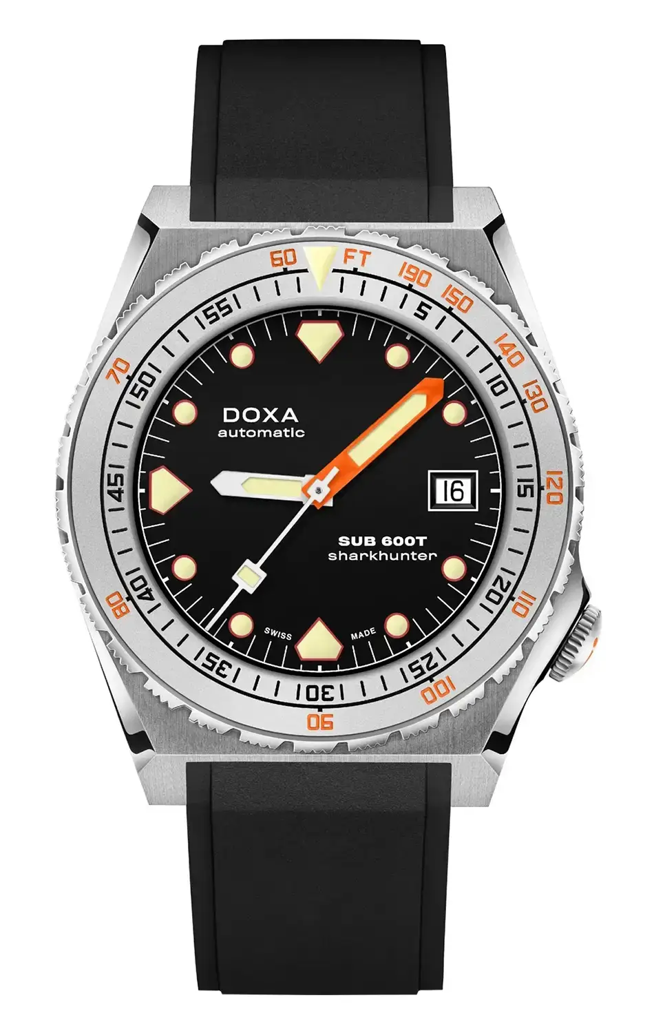 DOXA SUB 600T je znovuzrozena v roce 2021 – o více než 40 let později a dokáže víc než jen znovu navštívit kapitolu napsanou dávno. Značka vzdává hold ikonickému modelu SUB 600T novým příběhem, který právě vzniká. Po velkém úspěchu limitované edice titanových diverských hodinek Doxa SUB 600T Pacific Blue představuje DOXA SUB 600T v neomezené verzi, aby obohatila řadu profesionálních diverských hodinek DOXA SUB. Znovuzrozené diverské hodinky Doxa SUB 600T Sharkhunter jsou model dostupný v odolném pouzdře z nerezové oceli 316L, s černým páskem z kvalitní FKM pryže a rámem z pískované oceli se snadno čitelným černým ciferníkem uvnitř.