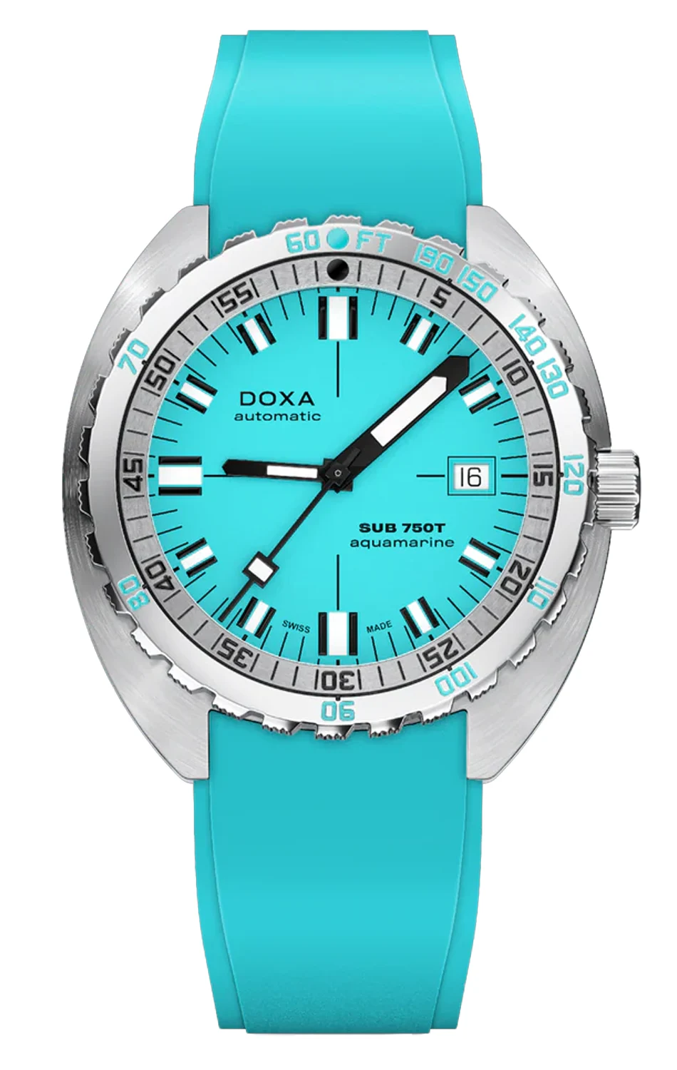 Doxa SUB 750T Aquamarine 825.10.241.25 jsou hodinky, které si okamžitě spojíte s potápěním v teplých vodách tropů. Tyrkysový odstín ciferníku v kombinaci s pohodlným pryžovým řemínkem vytváří dojem svěžesti a energie, díky čemuž tento model vyniká mezi klasickými potápěčskými hodinkami.