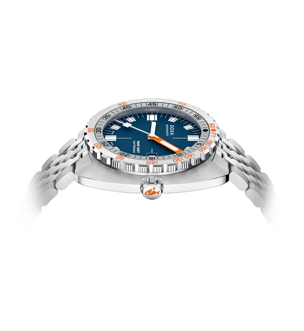 Pouzdro ve tvaru tonneau je vyrobeno z ušlechtilé oceli a nabízí vodotěsnost až do 750 metrů. Šroubovací korunka, dýnko a safírové sklíčko činí hodinky odolnými vůči extrémním podmínkám. Jednosměrně otočná luneta s dělením ve stopách je praktický nástroj nezbytný při potápění, který je už léta poznávacím znakem značky Doxa.
