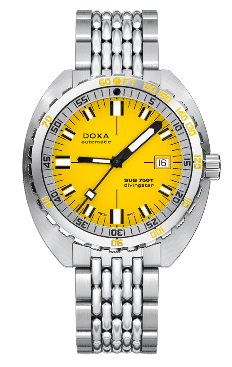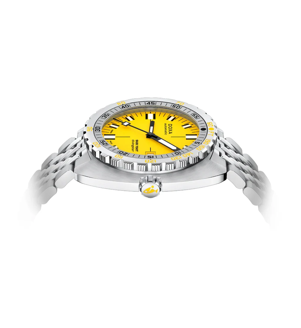 Doxa SUB 750T Divingstar 825.10.361.10 jsou hodinky, které si nelze splést s žádným jiným diverem. Intenzivně žlutý ciferník způsobil, že modely Divingstar patří už léta k nejrozpoznatelnějším v celé historii značky Doxa. Tato barva nebyla vybrána náhodou – její kontrast pod vodou je jedním z nejvyšších, což zajišťuje výjimečnou čitelnost i v temných a kalných hlubinách. Tyto hodinky byly vytvořeny pro ty, kteří se nebojí vyniknout a hledají profesionální nástroj s výrazným charakterem.