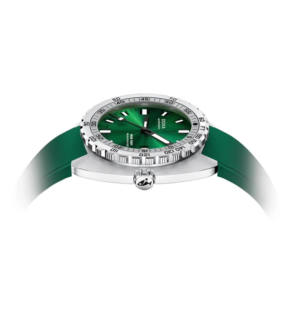 Pryžový řemínek odolný vůči vodě a UV záření podtrhuje sportovní charakter hodinek. Je pružný a pohodlný, a poskytuje komfort i při dlouhých potápěčských výpravách. Spona s možností prodloužení pro použití přes neopren umožňuje nosit hodinky bez omezení – ať už jste pod vodou nebo na souši.