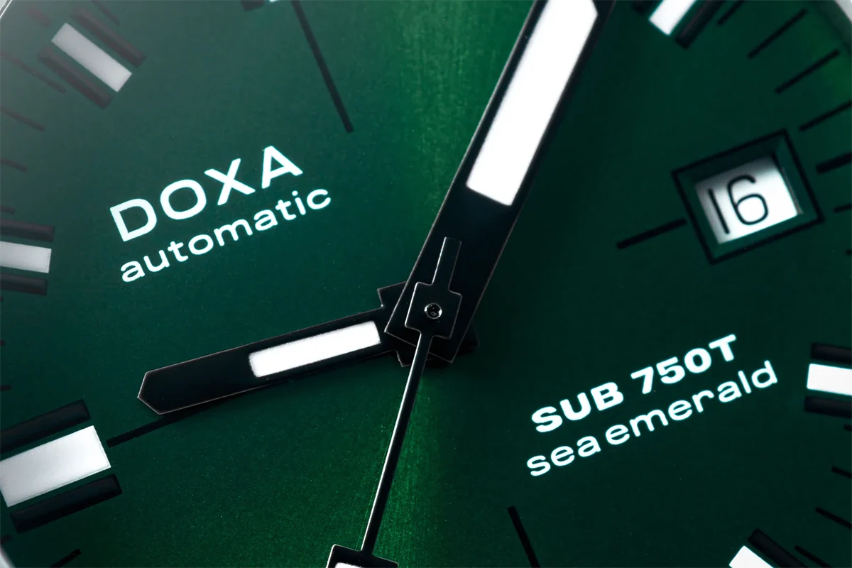 Automatický strojek Sellita SW300 s rezervou chodu 56 hodin zaručuje spolehlivost. Díky velkým ručkám a indexům potaženým Super-LumiNovou® zůstávají hodinky čitelné i v naprosté tmě – řešení, které si potápěči u modelů Doxa cení už desítky let.