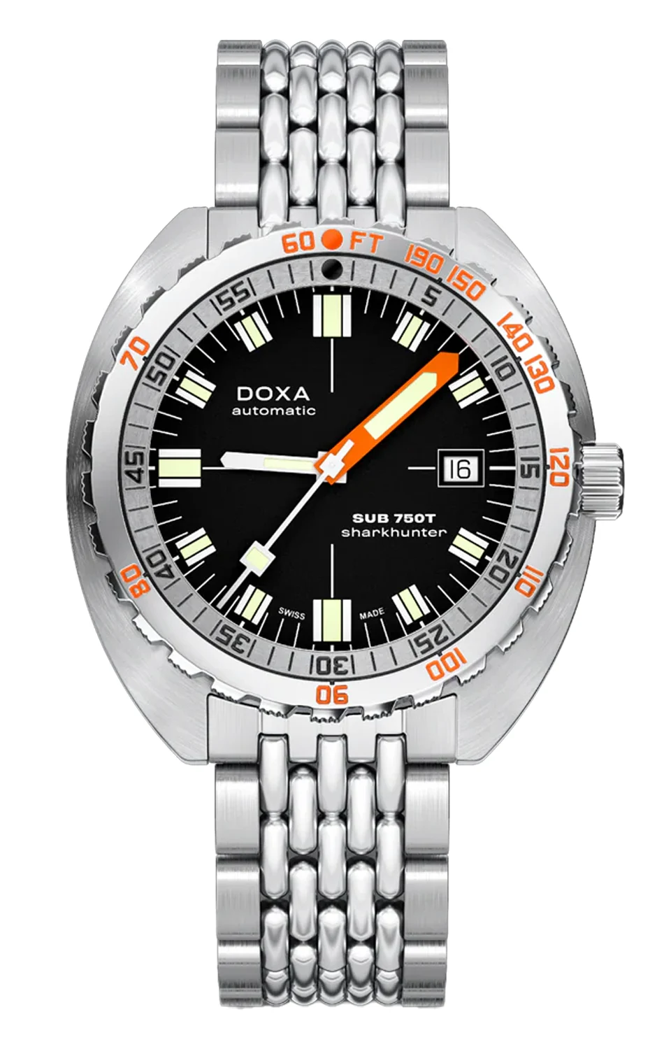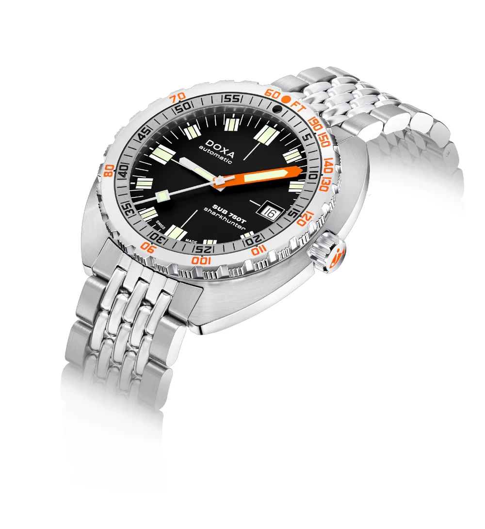 Doxa SUB 750T Sharkhunter 825.10.101.10 je jedním z nejznámějších modelů v rodině SUB, který již léta přitahuje milovníky hlubin klasickým černým ciferníkem a jedinečnou funkčností. Tato verze, osazená na kultovním náramku Beads of Rice, představuje spojení elegance a profesionálního potápěčského nástroje, který se osvědčí jak v oceánu, tak při každodenním nošení.