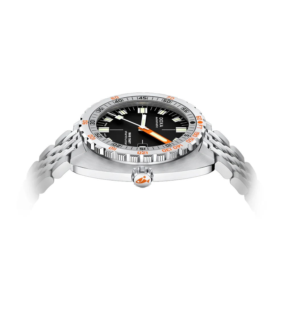 Pouzdro ve tvaru tonneau měří 45,00 × 47,00 mm při tloušťce pouhých 11,95 mm. Díky tomu hodinky, navzdory vysoké odolnosti vůči tlaku, skvěle sedí na zápěstí. Vodotěsnost 750 metrů, šroubovací korunka a dýnko a safírové sklíčko s antireflexní vrstvou zaručují spolehlivost i v extrémních podmínkách. Jednosměrně otočná luneta s dělením ve stopách je nejen prvkem tradice značky Doxa, ale především praktickým nástrojem, který už po desetiletí zachraňuje životy profesionálním potápěčům.