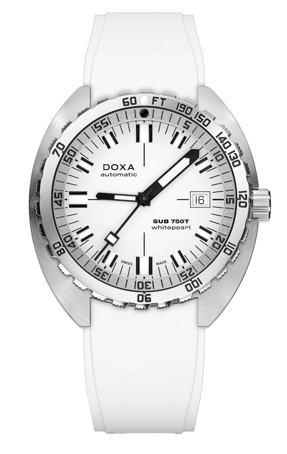 Doxa SUB 750T Whitepearl 825.10.011.23 je model, který spojuje výraznou jednoduchost s profesionální funkčností. Bílý ciferník jej odlišuje od klasických potápěčských hodinek a pryžový řemínek zdůrazňuje jeho sportovní charakter. Je to volba pro ty, kteří sází na spolehlivost, ale zároveň chtějí, aby jejich potápěčské vybavení vynikalo.