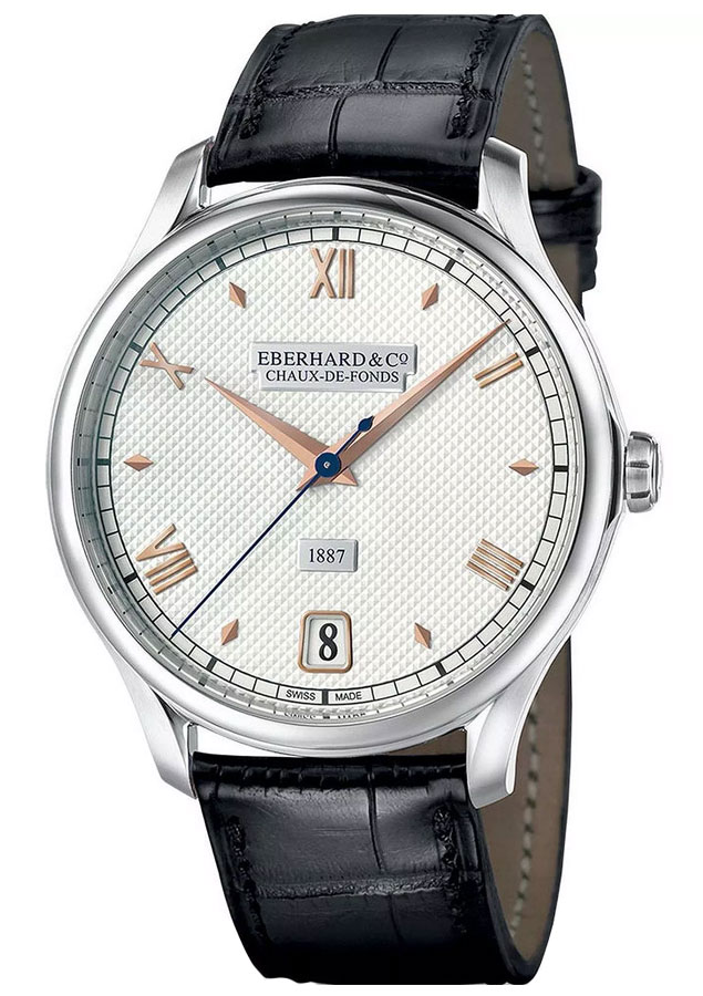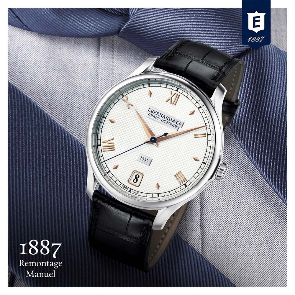 Hodinky Eberhard 1887 Remontage Manuel mají retro design s bílým ciferníkem clou de Paris, lichoběžníkovým okénkem s datumovkou, historickým logem Eberhard a datem výroby na štítcích a vysoce nádherným řemínkem z exotické kůže aligátora. Elegantní a originální charakter nabídky ovlivňují i aplikované zlacené římské indexy proložené těmi ve tvaru diamantu, rhodiované znaky dauphine a odpovídající lesk leštěného pouzdra z vysoce kvalitní oceli. Nabídka, která bude perfektní pro fanoušky Eberharda, milovníky prestižních mechanických hodinek a doplňků v elegantním retro / barokním stylu.