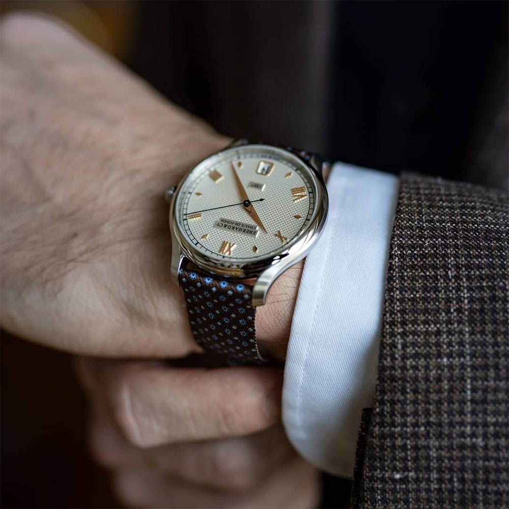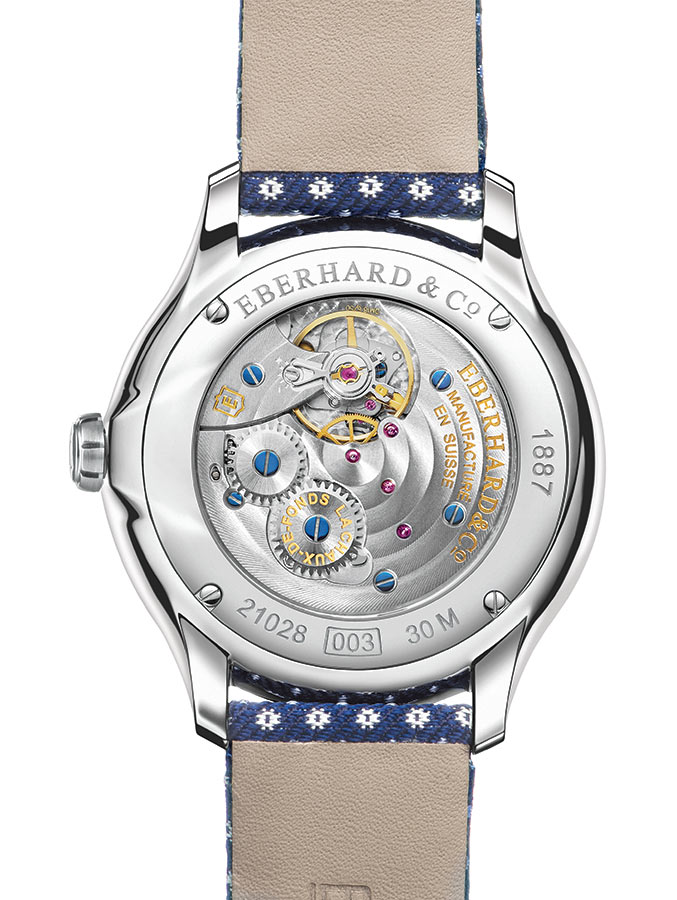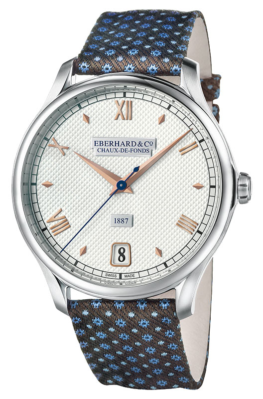 Na přední straně hodinky Eberhard 1887 Remontage Manuel 21028.02 CT ukazují sofistikovaný retro styl založený na ciferníku "clou de Paris", lichoběžníkové datumové okénko, historické a historické logo Eberhard a datum vytvoření, obojí na kartuších a naprosto speciální žakár . řemínek z hedvábí. Navrženo ve spolupráci s renomovanou italskou společností, která ztělesňuje neapolské řemeslo a moderní luxus - Ulturale Napoli. Retro estetiku ovlivňují i aplikované a pozlacené římské indexy proložené těmi ve tvaru diamantu, indicie a modrá vteřinovka korespondující s akcenty stejné barvy na řemínku. Model z kolekce 1887 Remontage Manuel je perfektní nabídkou pro fanoušky Eberharda, milovníky prestižních mechanických hodinek a doplňků v elegantním retro/barokním stylu.