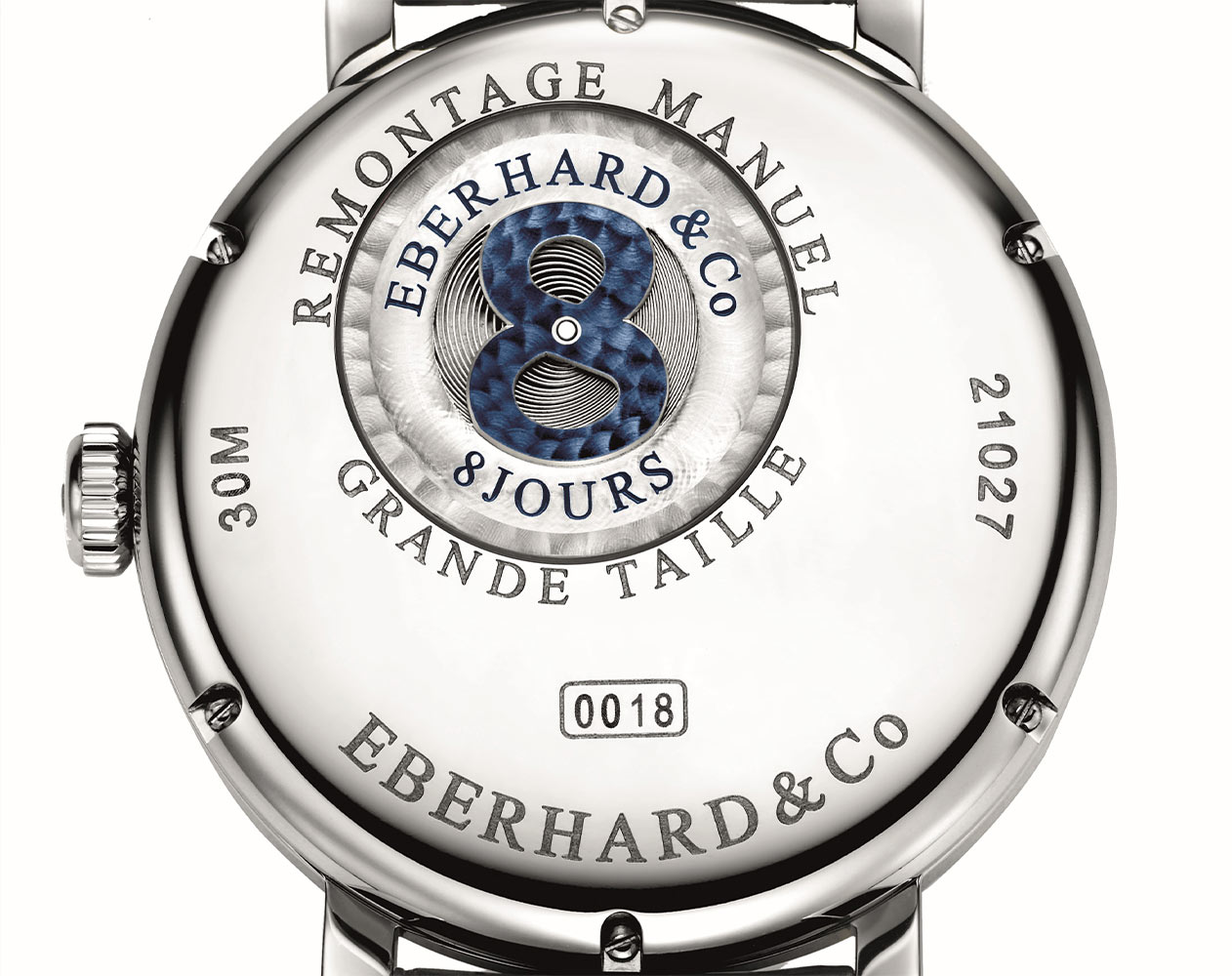 Pánské hodinky Eberhard 8 Jours Grande Taille 21027.6 CP vytvořené prémiovým švýcarským výrobcem Eberhard & Co. a inspirováno starými kapesními hodinkami. Vybaven patentovaným systémem pružinového pohonu a speciálním navíjecím prvkem umožňuje získat neuvěřitelně prostornou, až 8denní rezervu chodu. Ručně vinutý mechanický strojek je bohatě a originálně zpracován a jeho část je vidět přes safírový skleněný otvor v zadní části pouzdra. Speciálně zbarvená číslice "8", přes kterou je vidět druhá dlouhá pružina, působí efektním trojrozměrným dojmem.