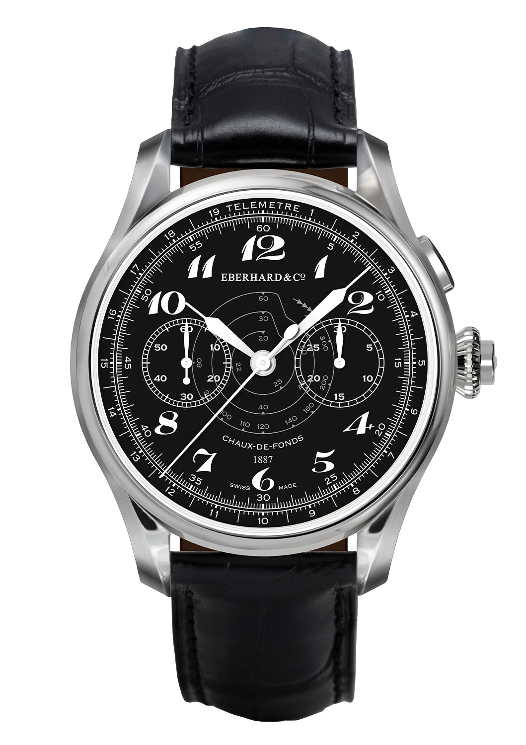 Uvnitř pouzdra hodinek Eberhard 1887 je instalován přesný automatický mechanismus EB 380, vycházející z Sellita AMT 5100. Jde o vynikající systém, který zajišťuje perfektní chod času a chronografu s velkou přesností. Tento model má navíc tachymetrickou stupnici, která udává rychlost pohybu na vzdálenost 1 km, a telemetrickou stupnici – funkci v hodinkách, která umožňuje měřit vzdálenost na základě času, který uplynul od zvuku (např. výbuch nebo záblesk) dosáhly pozorovatele. Všechny funkce a stupnice jsou umístěny na černém číselníku. Tmavé pozadí ciferníku zdobené jemnými detaily zdůrazňuje eleganci, zatímco bílé číslice a ručky zajišťují výbornou čitelnost.
