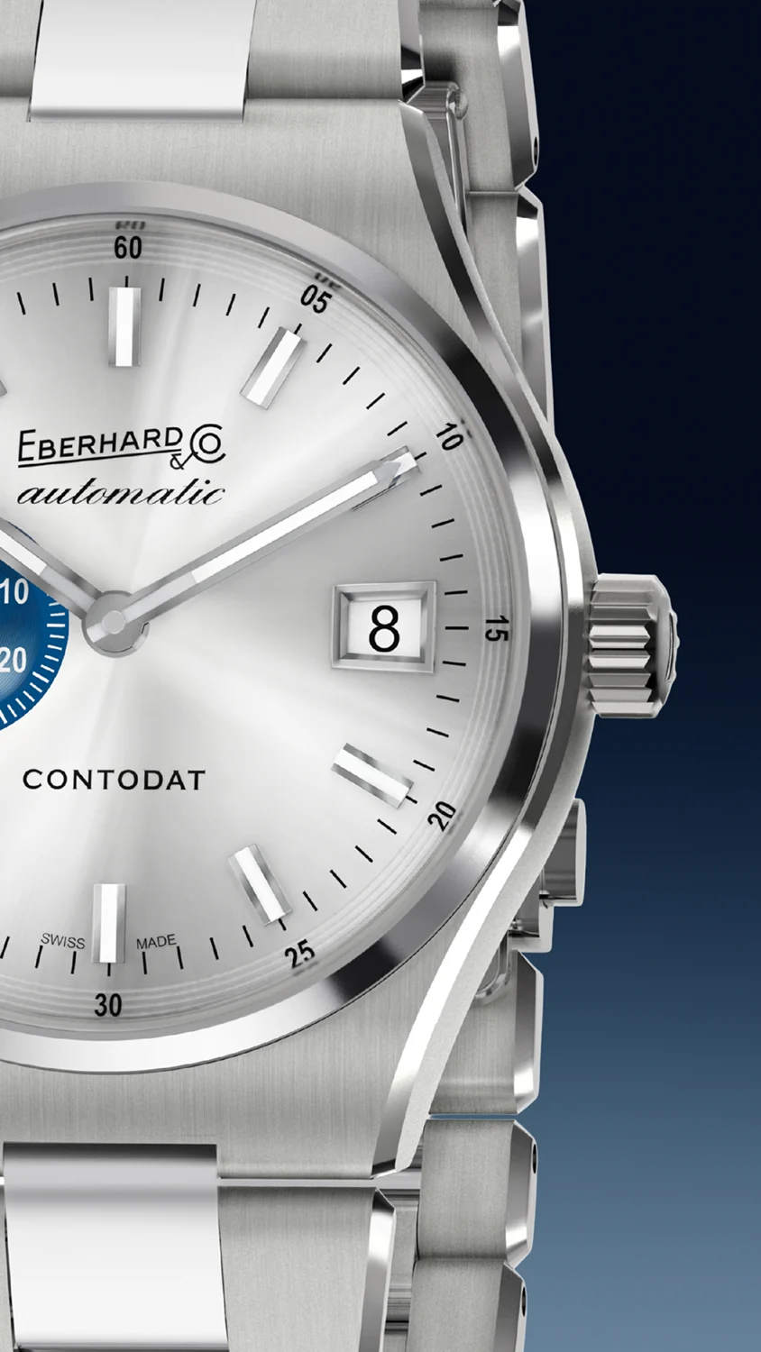 Stříbrný číselník s povrchovou úpravou soleil jemně odráží světlo a vytváří efekt jemného záblesku, který podtrhuje ušlechtilost materiálů a precizní geometrii detailů. Na levé straně se nachází malý sekundník s modrým pomocným subčíselníkem a kontrastní oranžovou ručkou — prvek s výrazným, dynamickým akcentem, který dodává kompozici sportovní charakter. Na třetí hodině je umístěno pro kolekci typické lichoběžníkové okénko data, které jemně odkazuje na původní modely Contodat ze 70. let.