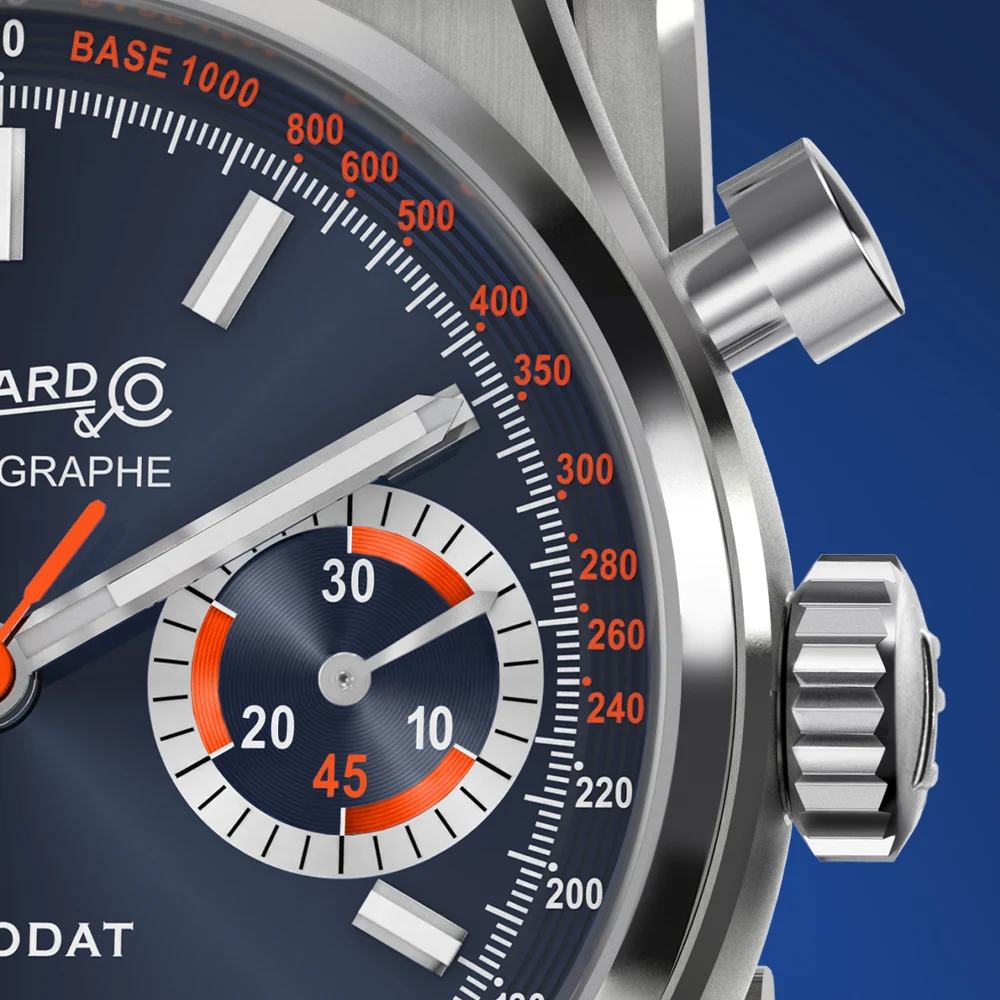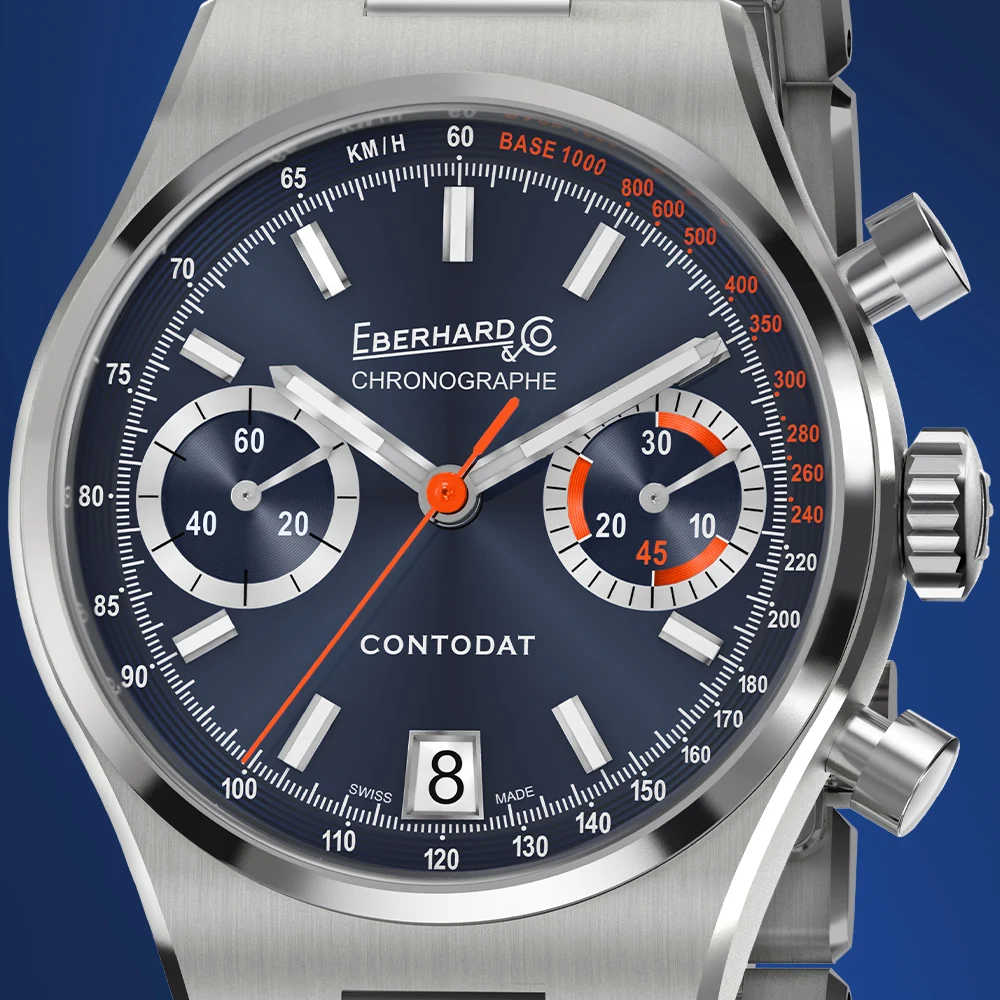 Chronograf Contodat se vyznačuje číselníkem s mimořádnou strukturou, na němž se střídají povrchové úpravy soleil a azuré. Díky nim číselník hraje světlem, vytváří hloubku a lesk, které oživují každý detail. Jemně rozmístěné subciferníky zachovávají dokonalou symetrii a centrální oranžová ručka chronografu přináší dynamický kontrast – symbol energie a přesnosti měření. Charakteristická 45minutová stupnice na minutovém počítadle při třetí hodině a lichoběžníkové okno data odkazují na kultovní model ze sedmdesátých let, nyní v moderní interpretaci.