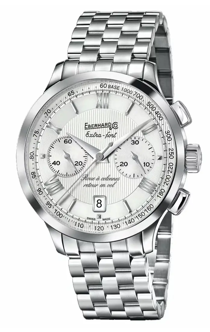 Eberhard Extra-Fort Roue à Colonnes Retour en Vol 31957.01 CA99 je automatický chronograf, který ve verzi na ocelovém náramku představuje nejuniverzálnější tvář kolekce Extra-Fort. Jsou to hodinky vytvořené pro osoby, které očekávají eleganci zakořeněnou v klasice, a zároveň chtějí využívat komfort každodenního nošení. Náramek dodává celku soudržnost a moderní rovnováhu, aniž by model připravil o jeho nadčasový charakter.