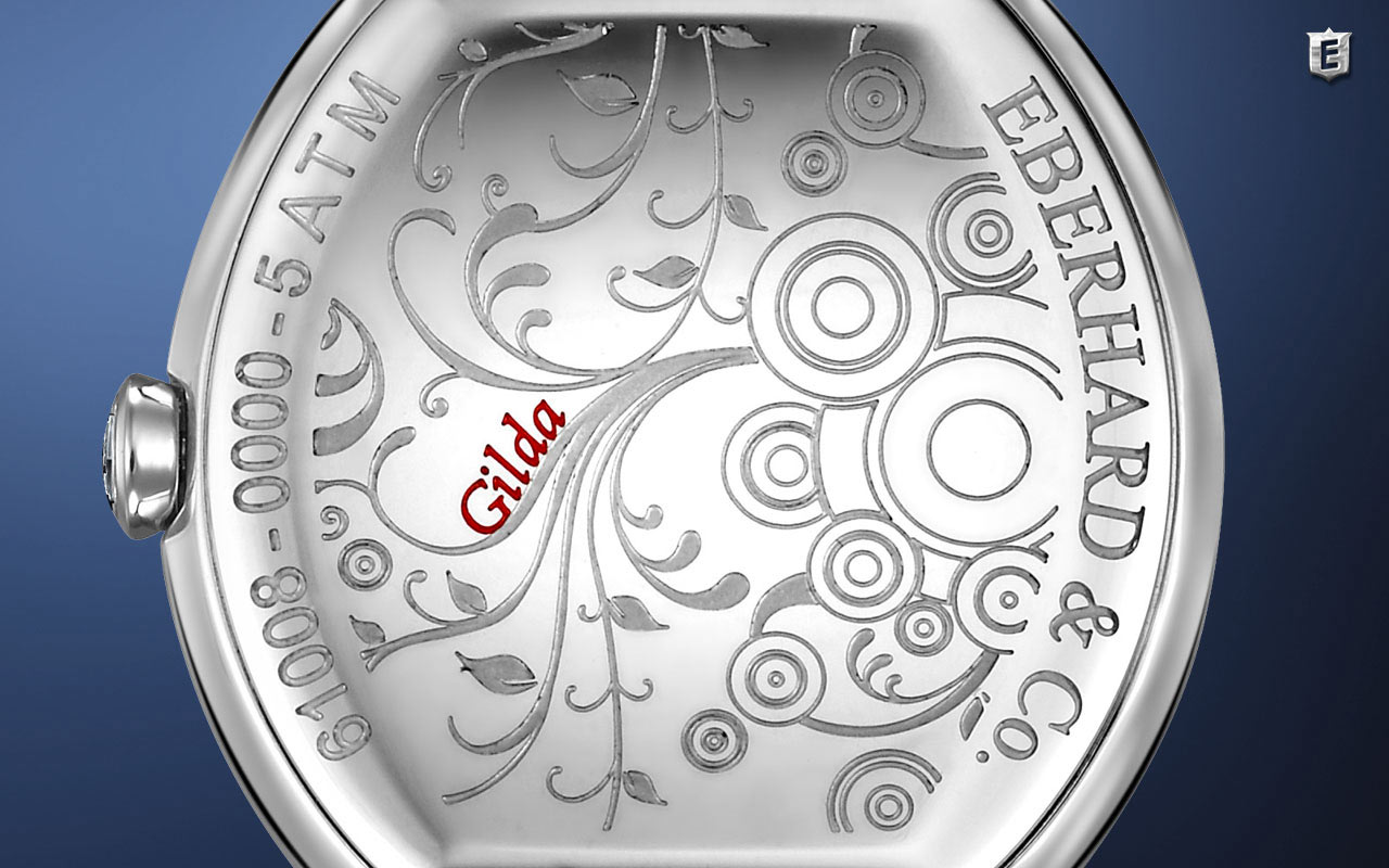 Dámské hodinky Eberhard Gilda 610081 mají oválné pouzdro o rozměrech 32 × 38 mm. Zadní strana pouzdra má kryt s ozdobným květinovým vzorem. Upevňuje se čtyřmi šrouby. Záměrem výrobce těchto luxusních hodinek bylo nabídnout mimořádný, elegantní produkt pro každé ženské zápěstí. Eberhard spojil své hodinky s masivním ocelovým náramkem CHÉRI® s motýlkovou sponou. Náramek je vyroben z malých ocelových korálků, což dodává celému designu kouzlo a charakter.