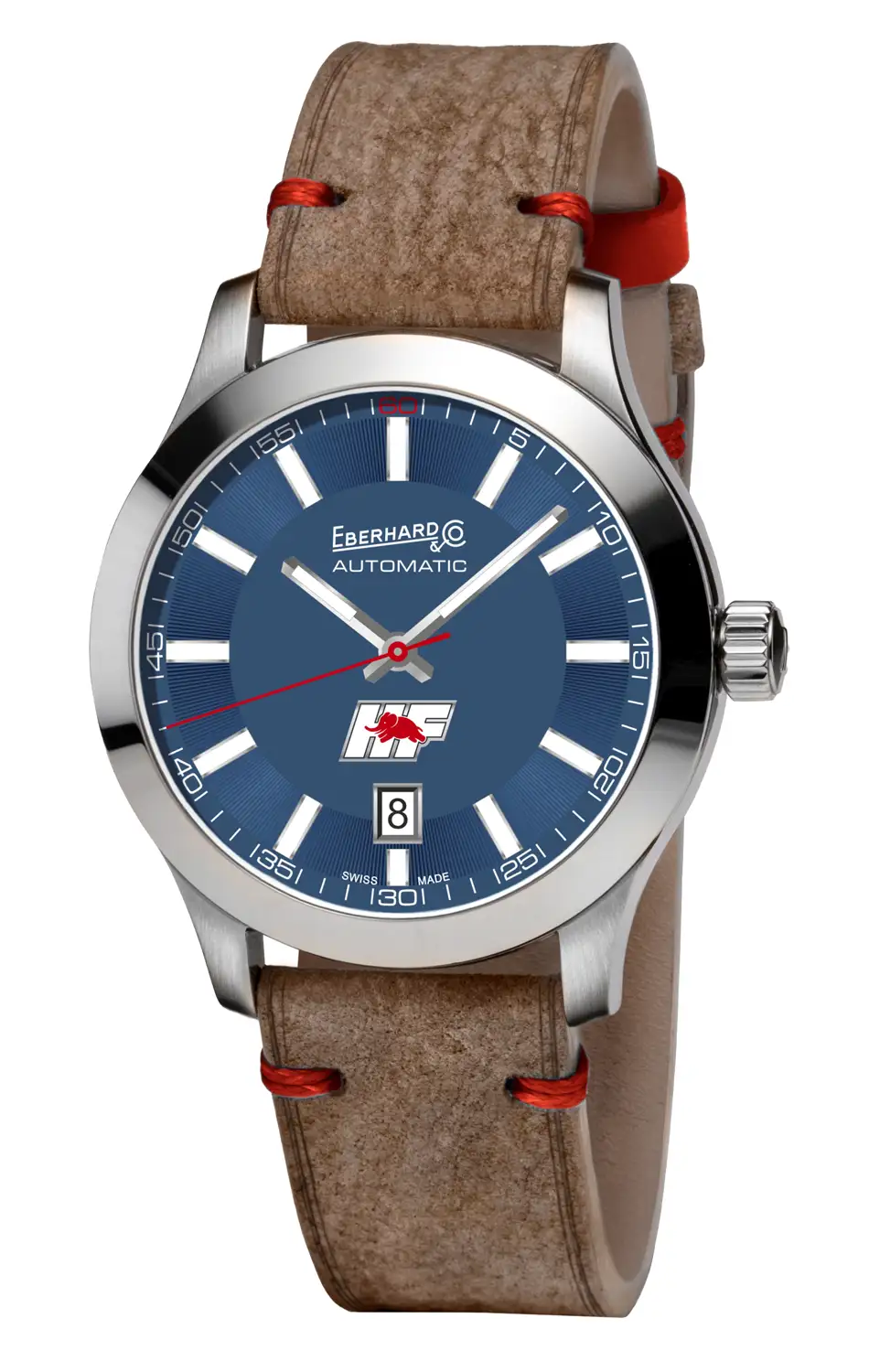 Uvnitř pracuje mechanický automatický strojek Eberhard, známý kultivovaným chodem a stabilitou přesnosti. Hodinky jsou osazeny koženým řemínkem ve světle hnědém, béžovém odstínu, stylizovaným do vintage vzhledu. Červené prošití a kontrastní červené poutko jemně odkazují na barevnost loga HF a posilují soudržnost celého projektu.