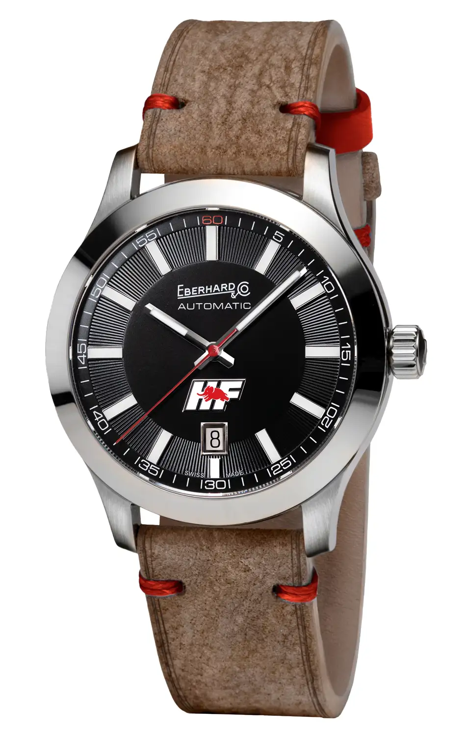 Uvnitř pracuje mechanický automatický strojek SW200-1 upravený společností Eberhard, ceněný pro stabilní chod a spolehlivost. Hodinky doplňuje kožený řemínek ve světle hnědém odstínu ve vintage stylu s červeným prošíváním a kontrastním červeným poutkem, které harmonicky navazují na barevnost loga HF a motorsportovní dědictví.